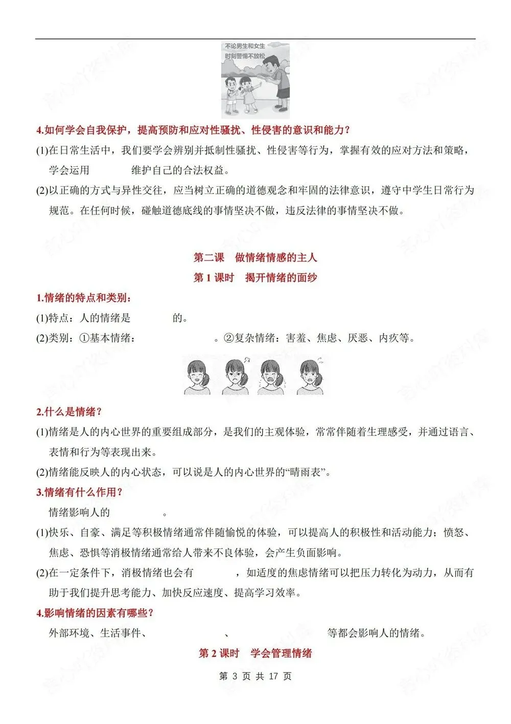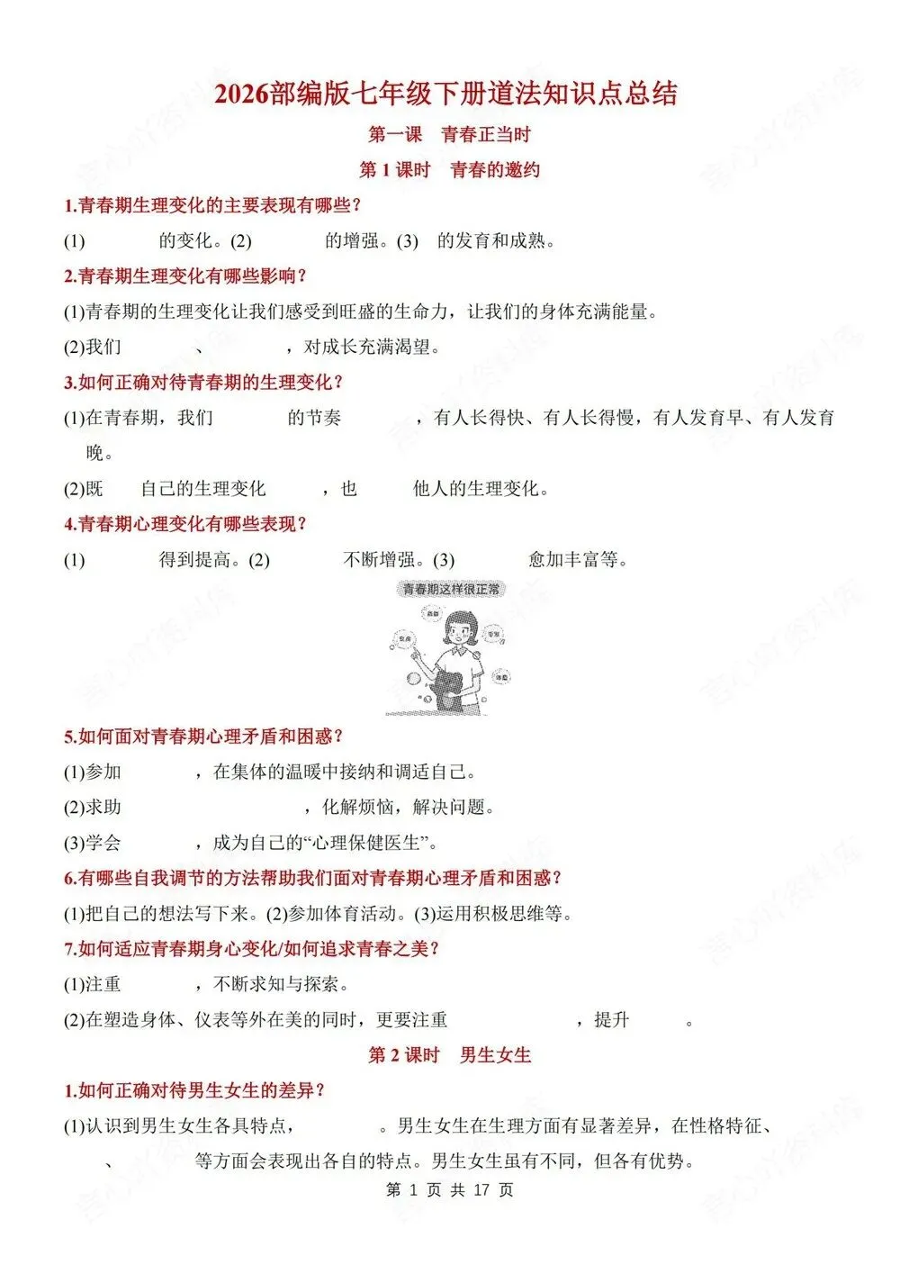 知识梳理,初中道法七年级下新教材初一下册,填空背记版,CZZH260259,