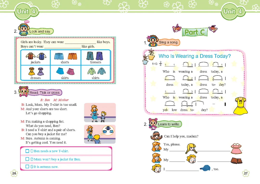 ,然后发送 电子课本 📚2026秋闽教版六年级英语上册第四单元,核心主题涵盖「Buying New Clothes(购买新衣服)」与「Hobbies and Interests(爱好与兴趣)」两大高频考点,是六年级上册重点进阶单元,更是小升初衔接的核心单元,贴合福建六年级学生学情,适配课前预习、课后巩固、期末复习和小升初刷题,既能夯实英语语言基础,又能学会用英语应对购物场景、表达个人爱好,吃透这些知识点,轻松应对课堂提问和单元测试,助力平稳衔接初中英语!本单元知识点兼顾实用性、考点性和应用性,重点攻克四大核心模块,细节拉满、好记好用,结合搜索到的考点补充易错点提醒,帮孩子避坑:一是核心词汇,按“四会、三会、拓展”分类,重点掌握两大场景词汇——购物类(clothes衣服、dress连衣裙、T-shirtT恤衫、jacket夹克、sweater毛衣、trousers裤子、shoes鞋子、cap帽子、try on试穿、go shopping购物、size尺寸、pair一双)、爱好类(hobby爱好、hiking远足、puzzle谜、read stories读故事、do kung fu练功夫、cook Chinese food做中国食物、study Chinese学习中文、do word puzzles猜字谜、pen pal笔友),拓展delicious、different、often等实用词汇,特别提醒易错点:hobby的复数是hobbies(以辅音字母+y结尾,变y为i加es);try on的用法(代词放中间,名词可放中间或后面,如try it on、try the dress on);play与球类搭配不加the、与乐器搭配加the的区别,千万别混淆;以f/fe结尾的名词变复数规则(如leaf→leaves、roof→roofs),以及动词第三人称单数变化(study→studies、watch→watches),搭配场景分类记忆法(购物、爱好分开记,对应短语联动记忆),比死记硬背更高效,还能结合高频短语巩固,如go hiking、do word puzzles、try on a dress等;二是核心句型,全是购物场景和爱好表达的实用句式,重点掌握四大场景句型:购物场景(Can I help you? 我能帮你吗?I need a dress and a pair of shorts. 我需要一条连衣裙和一条短裤。Can I try it on? 我能试穿它吗?She looks beautiful in her new dress. 她穿新连衣裙看起来很漂亮)、爱好询问与表达(What are his hobbies? 他有什么爱好?He likes doing kung fu and swimming. 他喜欢练功夫和游泳。Does he like doing word puzzles and going hiking? 他喜欢猜字谜和远足吗?Yes, he does./No, he doesn't.)、笔友相关询问(Can I also be his pen pal? 我也能成为他的笔友吗?Does he live in China, too? 他也住在中国吗?),每个句型都搭配简单易懂的例句,贴合日常交流场景,孩子学完就能用,还能进行情景对话和短文仿写练习;三是核心语法,重中之重是一般现在时第三人称单数的综合运用,掌握he/she/it作主语时,动词要变三单形式,明确“like + 动词-ing形式”表示“喜欢做某事”的固定用法,同时巩固购物场景中情态动词can的用法(后接动词原形),区分try on、go shopping等短语的固定搭配,补充字母组合er的发音规则(如mother、teacher中发/ə/音),助力听力提升,还提醒核心易错点——英语句子中不能有两个实义动词连用,需用不定式、动名词或连词连接,避免书写错误;四是小升初衔接补充,本单元常考题型为单词翻译、单项选择、句型转换、情景对话和短文仿写,贴心给出答题技巧,如句型转换时借助助动词do/does,短语搭配题牢记固定用法,短文仿写可围绕“爱好介绍”或“购物经历”展开,结合单元句型和短语即可,整体难度贴合六年级进阶节奏,兼顾听说读写,帮孩子夯实语言应用能力,同时衔接初中英语的句式和语法基础。