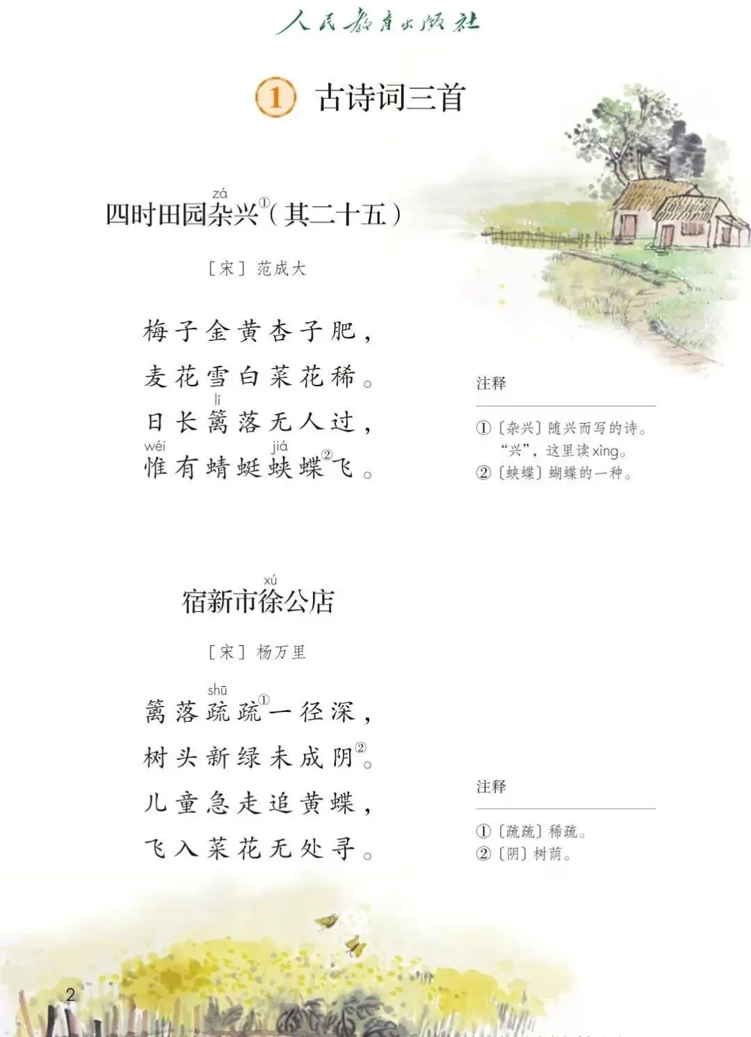 ①前两句诗用梅子黄、杏子肥、麦花白、菜花稀,突出了夏季南方农村景物的特点,有花有果,有色有形,色彩鲜丽,写出了田园之美。