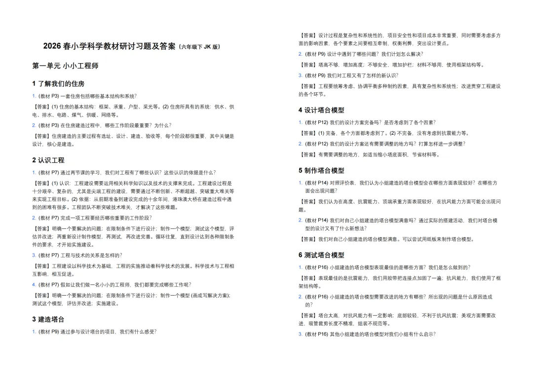 【六下 JK 版】2026春小学科学教材研讨习题及答案