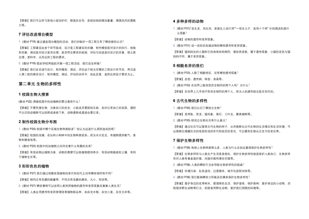 - 1. (教材P38)地球上生物种类那么多,人类为什么还如此重视保护生物多样性?【答案】生物多样性与人类生产生活息息相关,保护生物多样性就是保护人类自己;生物多样性对人类有着直接价值、间接价值和潜在价值等。