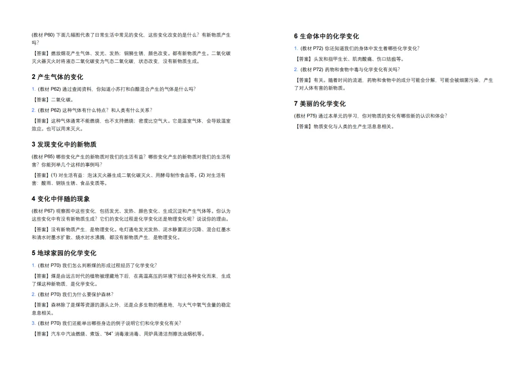 - 2. (教材P35)研究古生物化石有什么意义?【答案】通过化石可以复原古代生物的样子,从而推断出古代生物的生活情况和生活环境;可以推断出埋藏化石的地层形成的年代和经历的变化,可以看到生物从古至今的变化等。
