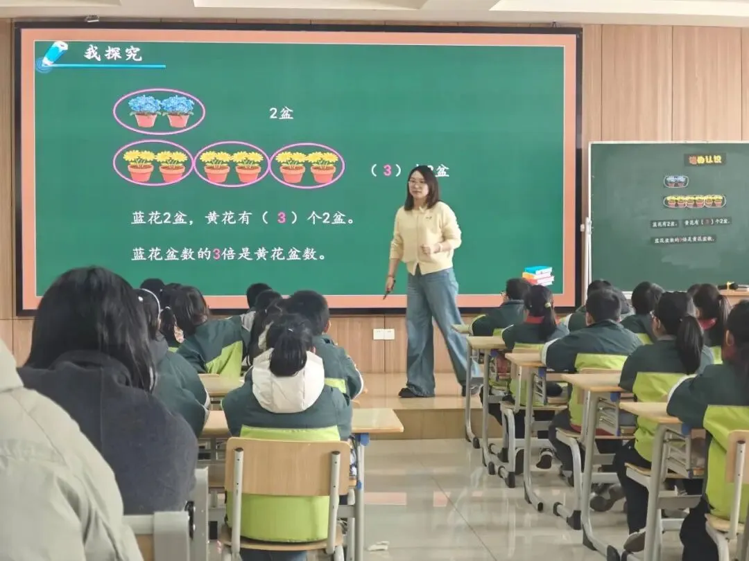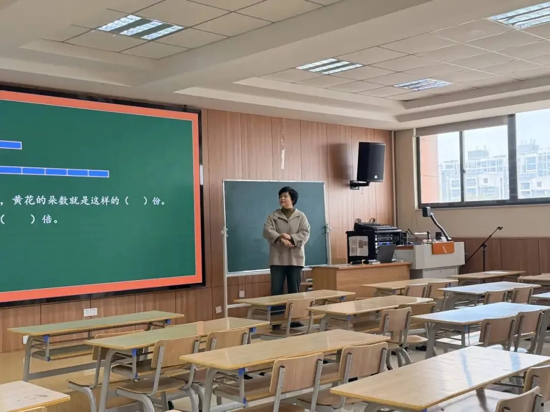 丹徒区茅以升实验学校严慧老师的模拟课堂《求一个数量的几倍是多少的简单实际问题》,立足低年级学生以具象思维为主的认知特点,围绕“倍”的意义建构与乘法算理理解展开教学。课堂充分运用摆一摆、圈一圈、画一画、说一说等直观活动,引导学生先确定“1份数(标准量)”,再数出“有这样的几份”,把“几倍”转化为“几个几”,让学生在动手与表达中自主建构:求一个数的几倍是多少,就是求几个几相加,用乘法计算。操作有层次、表达有规范,有效突破“倍”的抽象性难点。