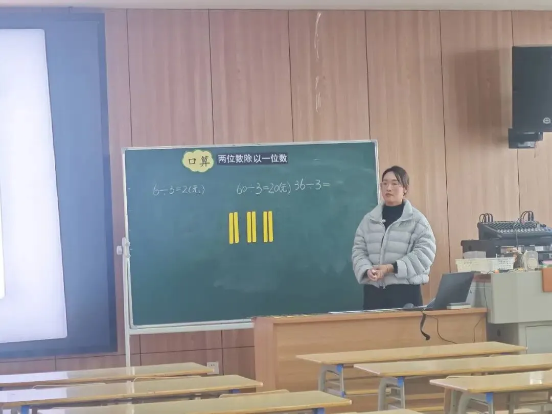 丹徒区实验学校的陈淑锦老师在模拟课堂《口算两位数除以一位数》中,创设学生熟悉的生活情境,通过方块动手操作,数形结合,帮助学生从“具象”到“抽象”,从一位数除法迁移到整十数,再到两位数拆分,从而达成教学目标。