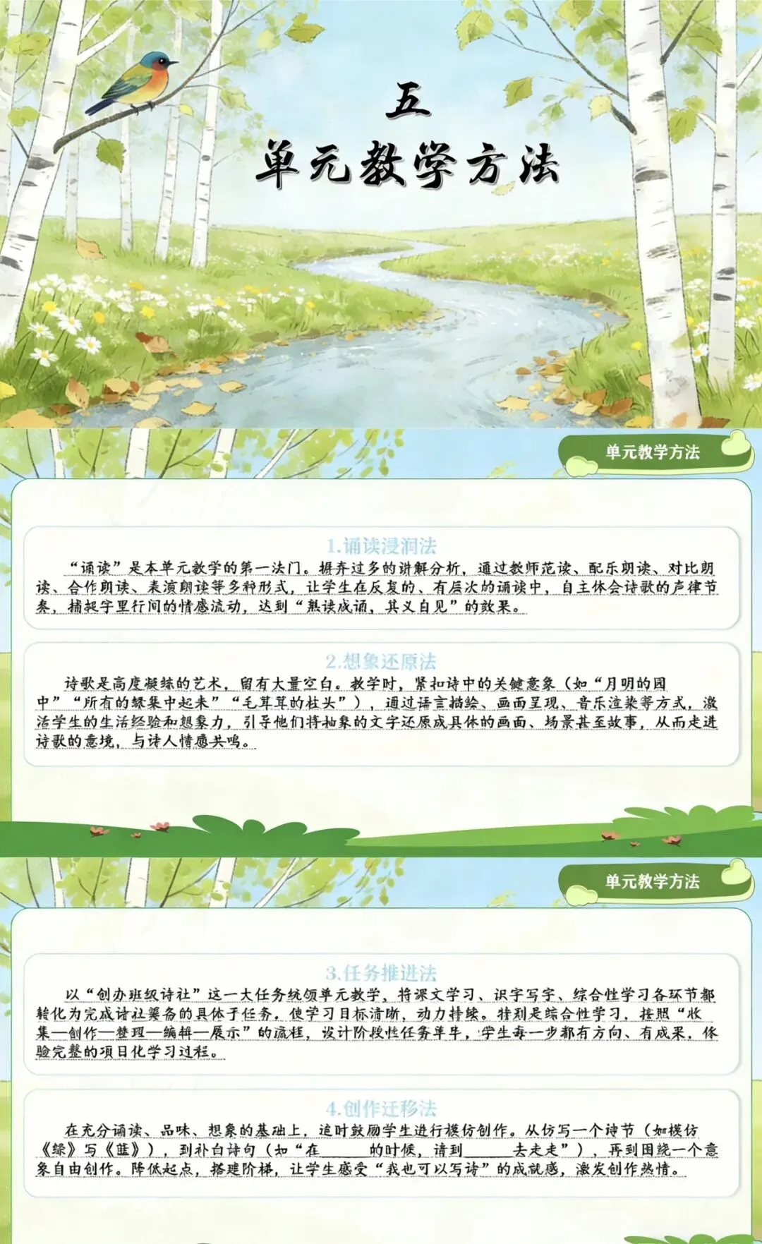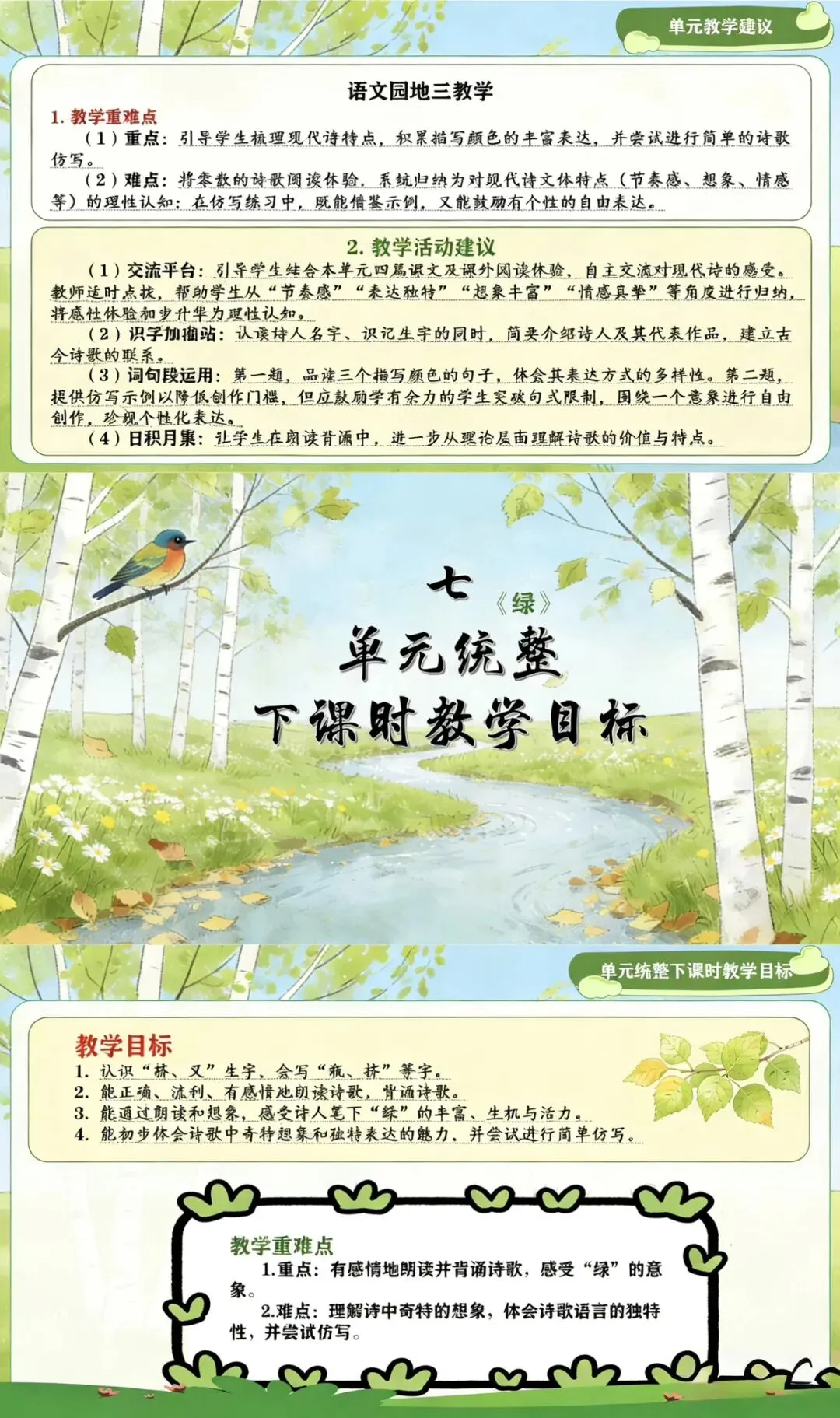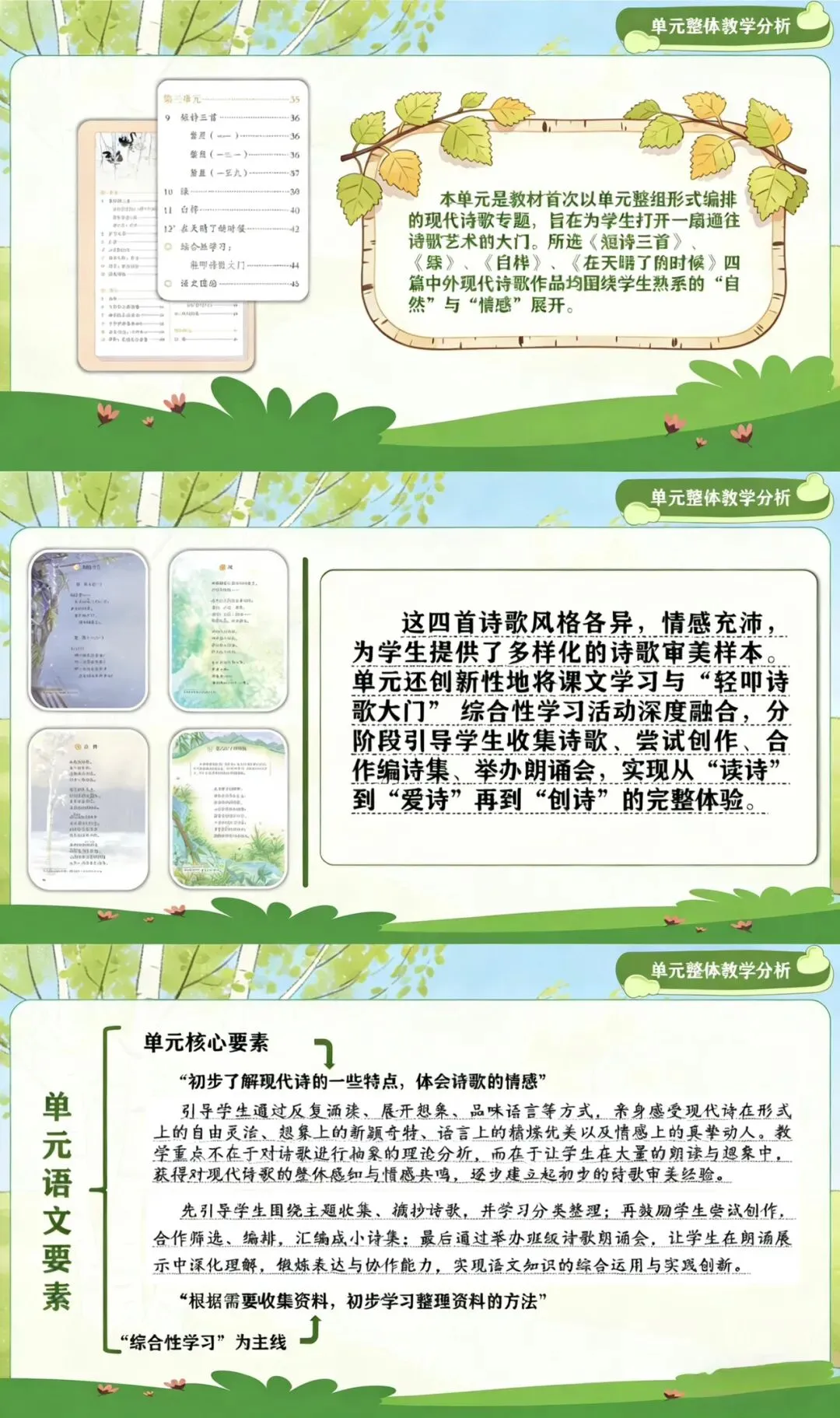 这是小学阶段首个以现代诗歌为主题的独立单元,编排了冰心的《短诗三首》、艾青的《绿》、叶赛宁的《白桦》、戴望舒的《在天晴了的时候》四篇中外诗歌作品,并围绕“轻叩诗歌大门”开展了贯穿单元的综合性学习。