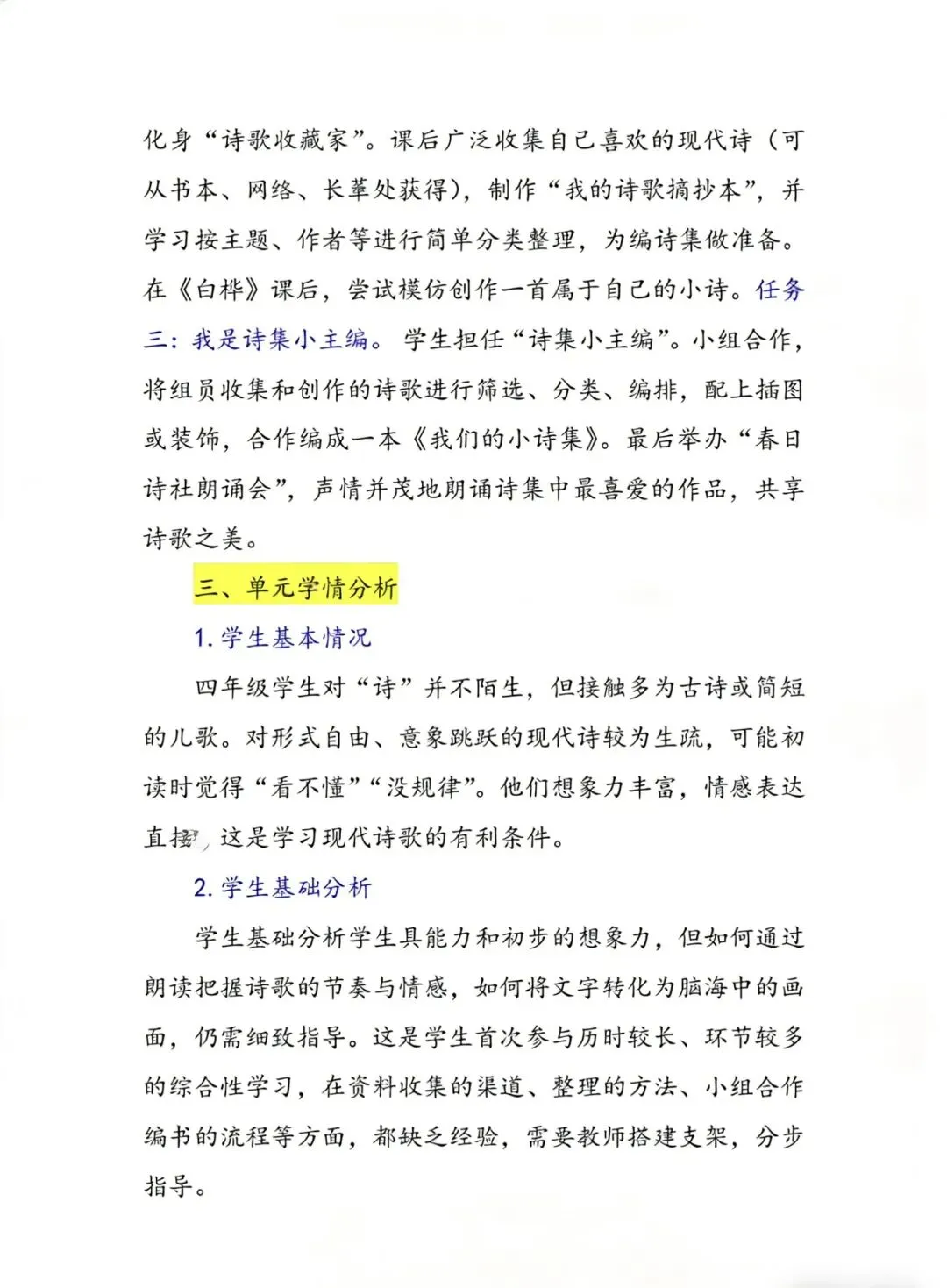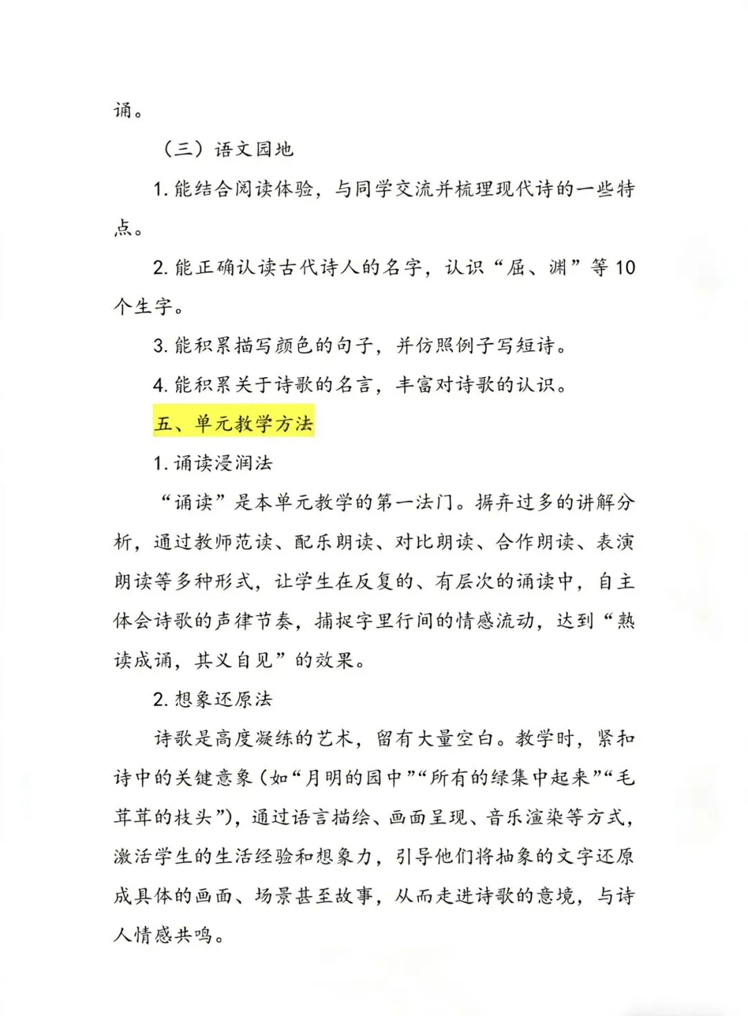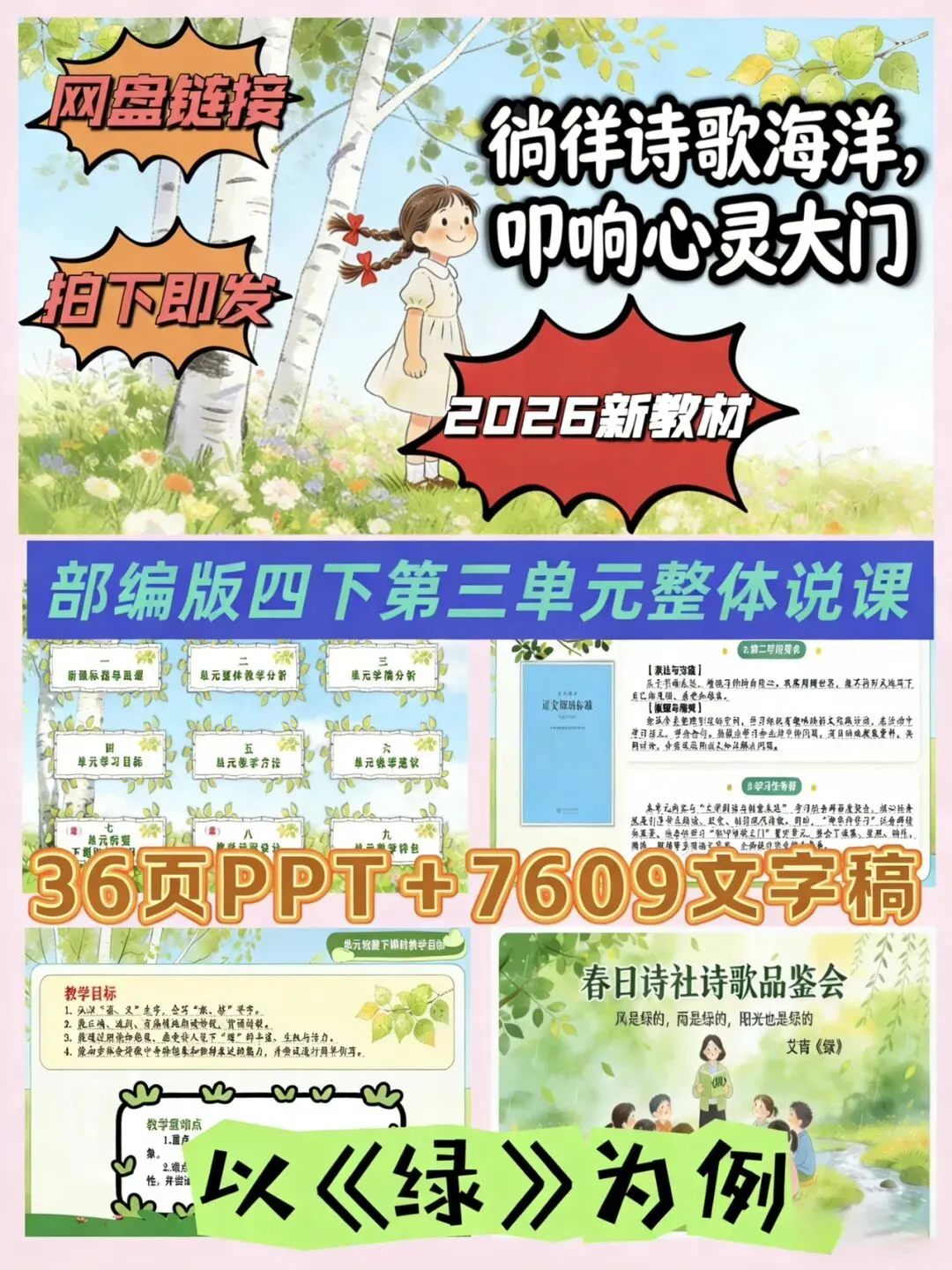 这是小学阶段首个以现代诗歌为主题的独立单元,编排了冰心的《短诗三首》、艾青的《绿》、叶赛宁的《白桦》、戴望舒的《在天晴了的时候》四篇中外诗歌作品,并围绕“轻叩诗歌大门”开展了贯穿单元的综合性学习。