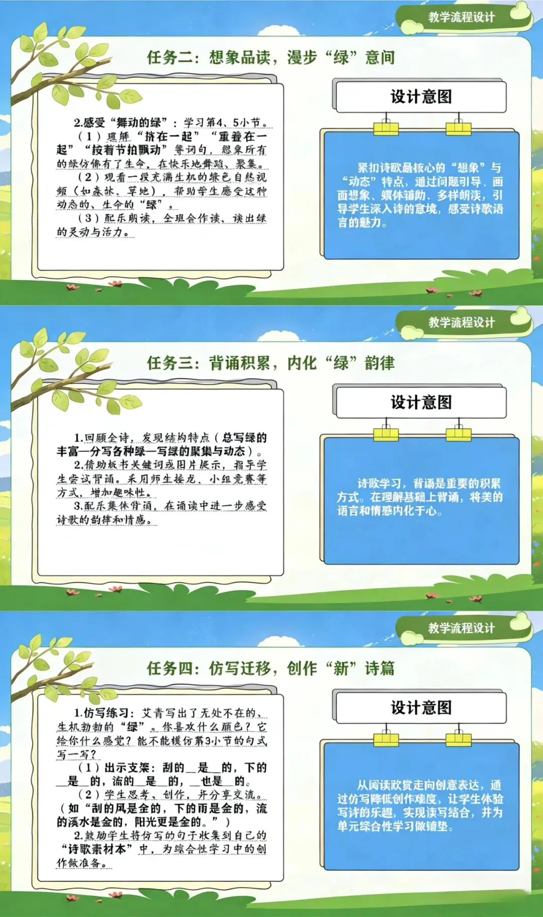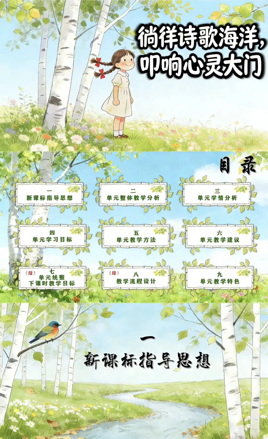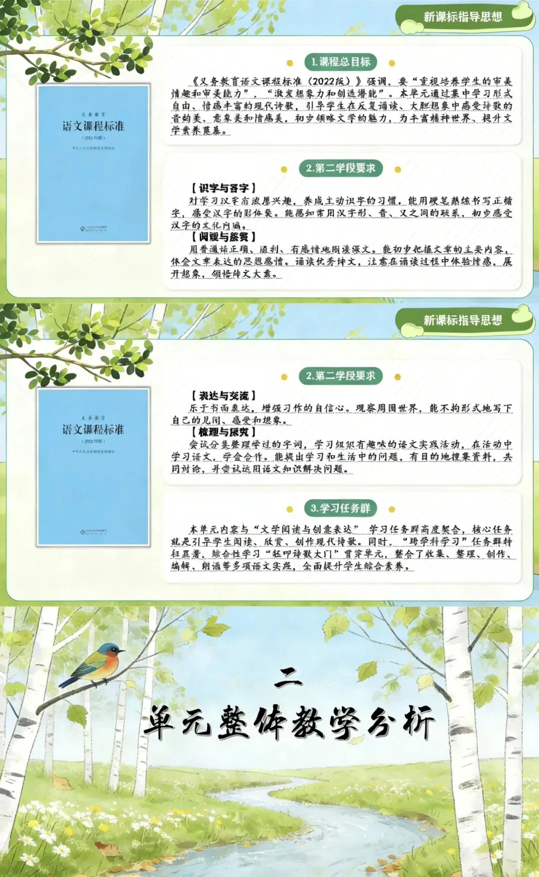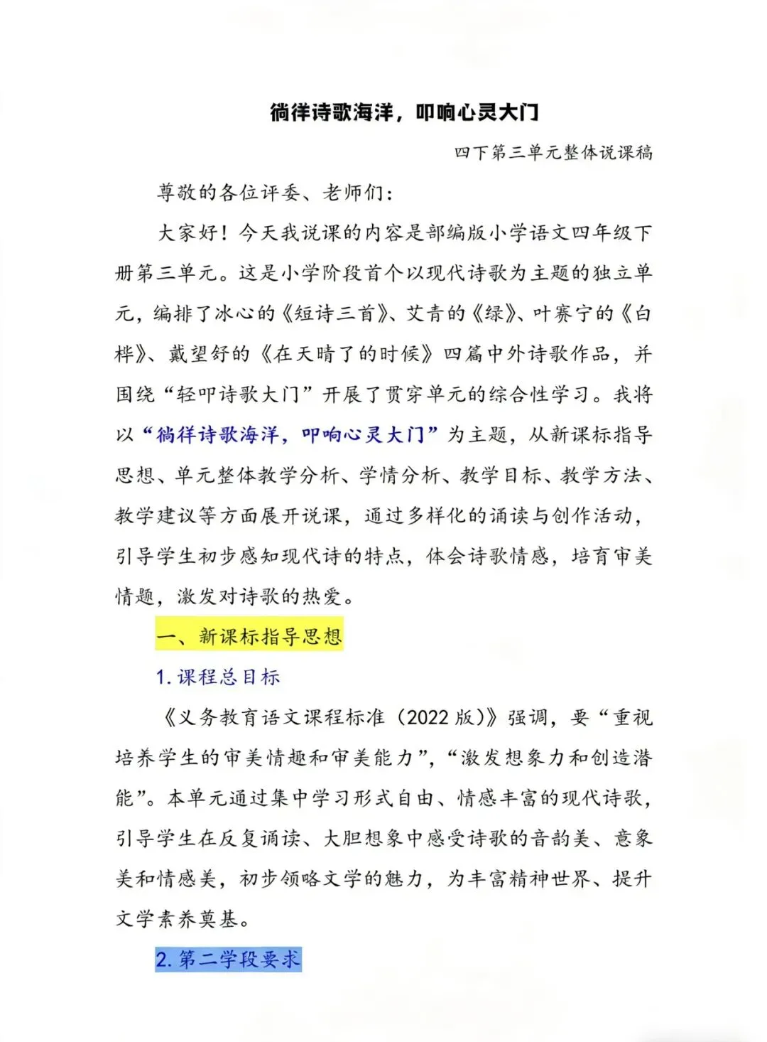 ✏️我将以“徜徉诗歌海洋,叩响心灵大门”为主题,从新课标指导思想、单元整体教学分析、学情分析、教学目标、教学方法、教学建议等方面展开说课,通过多样化的诵读与创作活动,引导学生初步感知现代诗的特点,体会诗歌情感,培育审美情趣,激发对诗歌的热爱。