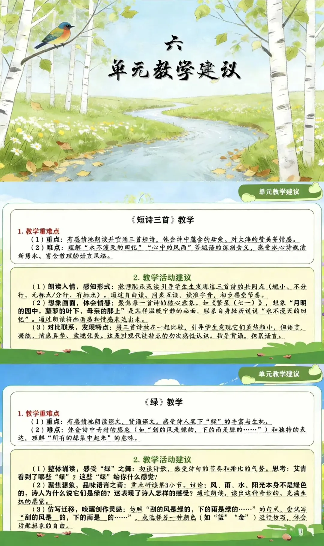✨本单元是教材首次以单元整组形式编排的现代诗歌专题,旨在为学生打开一扇通往诗歌艺术的大门。所选四篇中外现代诗歌作品均围绕学生熟悉的“自然”与“情感”展开:冰心《短诗三首》(《繁星(七一)》《繁星(一三一)》《繁星(一五九)》)以母爱、童真、自然为主题,语言清新隽永;艾青《绿》以丰富的想象描绘了无处不在、生机勃勃的绿色世界;苏联诗人叶赛宁的《白桦》以细腻的笔触和拟人化的手法,礼赞了白桦高洁、挺拔的形象;戴望舒《在天晴了的时候》则用活泼灵动的语言,邀请读者漫步雨后乡间,感受自然与生命的清新。这四首诗歌风格各异,情感充沛,为学生提供了多样化的诗歌审美样本。单元还创新性地将课文学习与 “轻叩诗歌大门” 综合性学习活动深度融合,分阶段引导学生收集诗歌、尝试创作、合作编诗集、举办朗诵会,实现从“读诗”到“爱诗”再到“创诗”的完整体验。