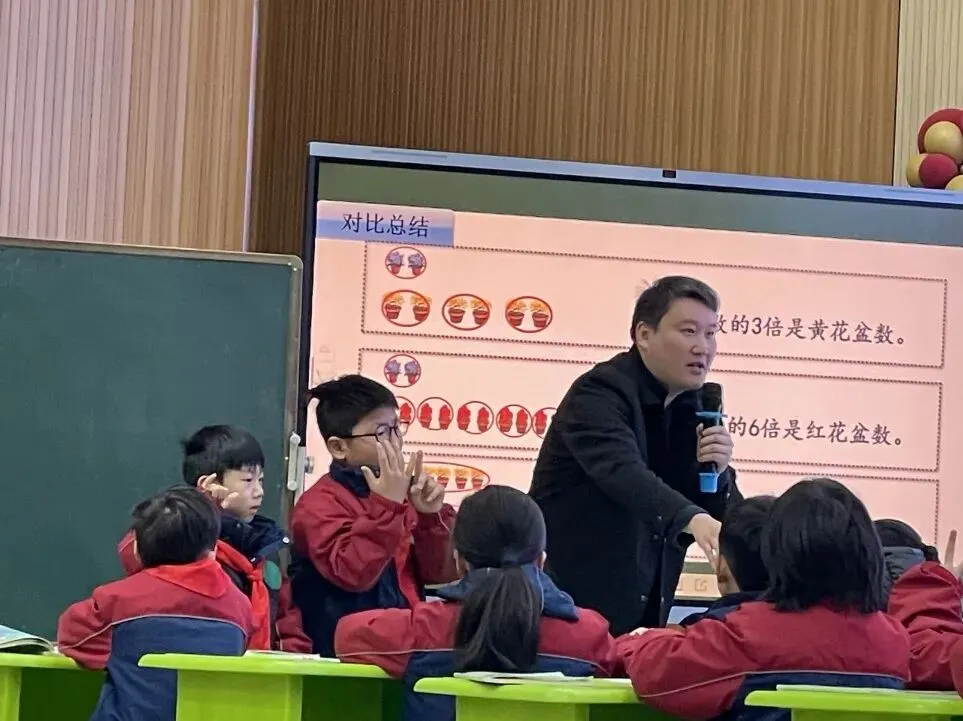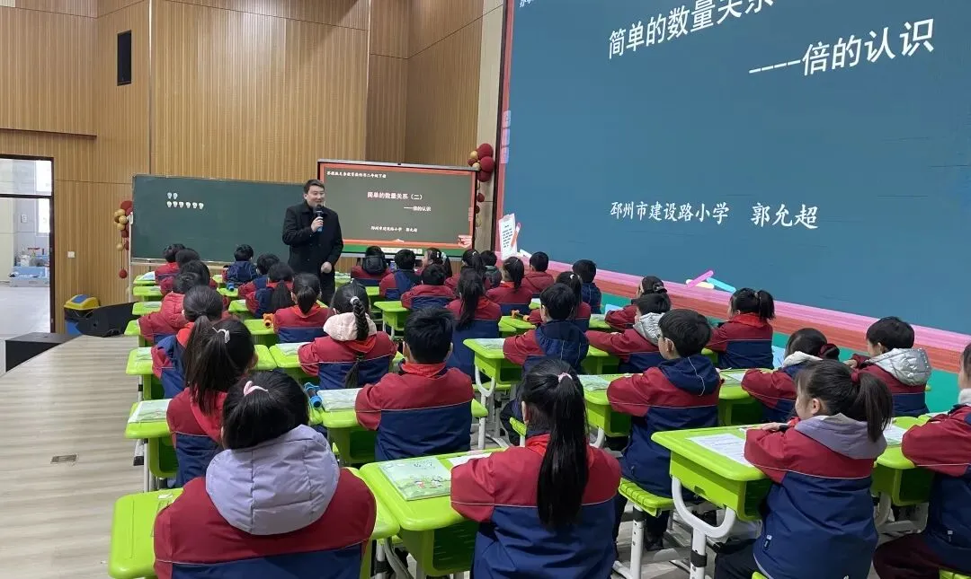 首先,邳州市建设路小学的郭允超老师执教二年级下册《简单的数量关系(二)》一课。课堂伊始,郭老师从学生的已有认知“差比”关系出发,尊重学生的起点。核心环节通过圈一圈、填一填的具象化操作,将抽象的“倍”转化为可视的“几份”,让思维可视化,打通“倍”与旧知“几个几”的内在联系,在比较中突出“标准”的价值,感受“一份与几份”的本质关系,形成“倍”的模型结构。这一过程既让学生掌握了数量关系的本质,又通过 “观察——比较——推理——归纳” 的思维链条,有效培养了逻辑推理能力与模型思想,精准落实数学核心素养目标。