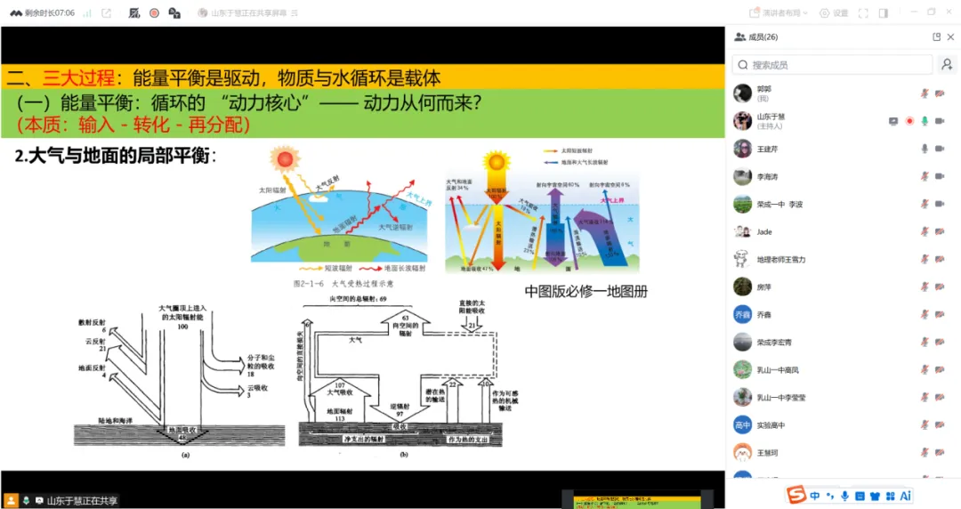 荣成三中郭建老师担纲第一、二章节主讲,重点阐释"圈层相互作用与地貌系统"的宏观底层逻辑。她从学科素养锚定出发,系统梳理了综合思维与地理实践力在高中教学中的落点,深入剖析能量驱动物质流动、圈层相互作用塑造地貌的核心主线。"地貌本质是圈层物质能量交换的空间结果",郭建老师通过大气圈与水圈、水圈与岩石圈的典型案例,揭示了2022年全国乙卷海岸线变化题、2021年福建卷河口地貌演变题背后的大学教材逻辑。