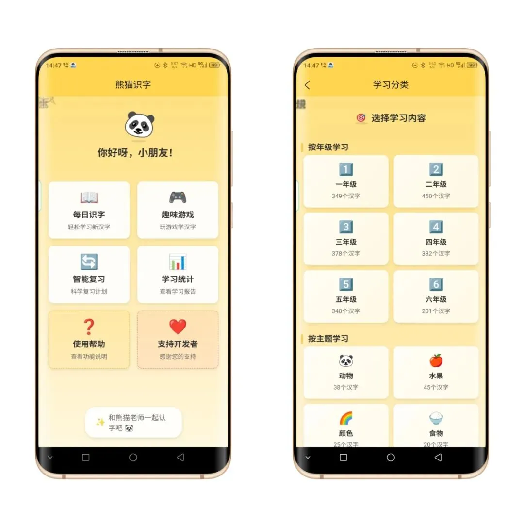 以可爱熊猫为主题形象,采用独创七步识字法,搭配 Q 版动画、真人配音与闯关游戏,让孩子在玩乐中高效认字