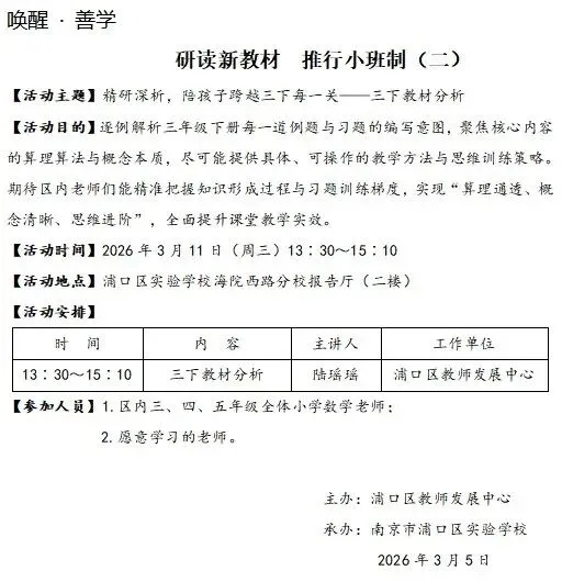 此次新教材培训,立足教学实际、聚焦教师需求,以专业引领为抓手,助力教师夯实教学基础、提升教学能力。愿全体数学教师以此次培训为契机,深研细悟教材内涵、灵活运用教材资源,持续锤炼教学本领、提升专业化水平,凝心聚力、笃行致远,共同推动浦口区小学数学教育教学事业高质量发展。