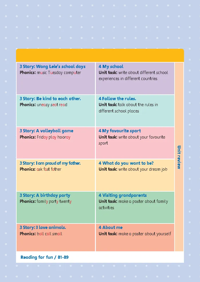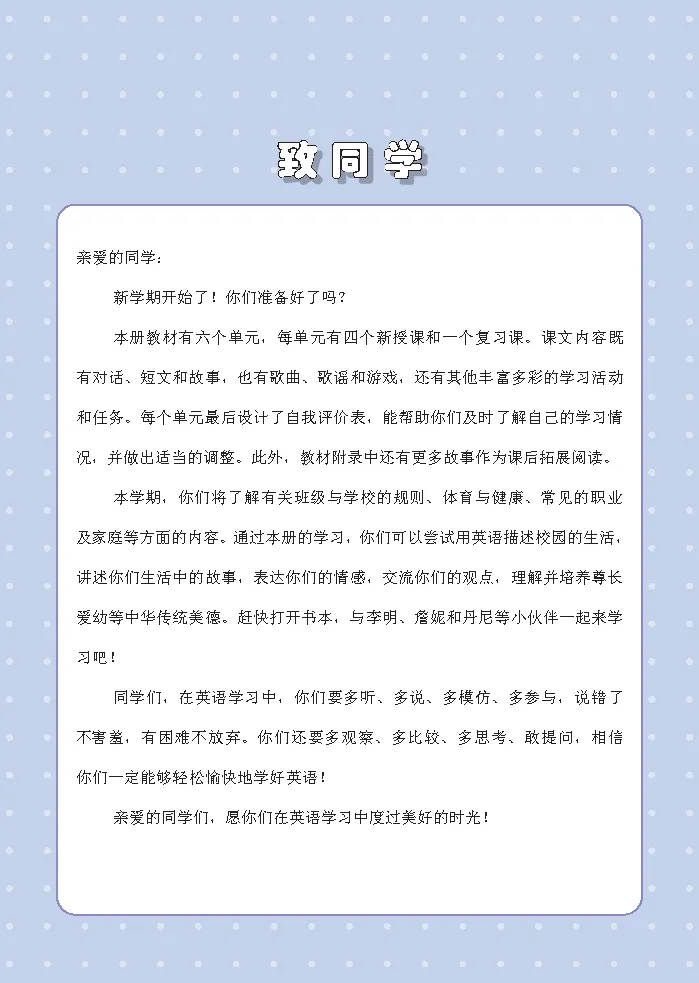 ,然后发送 电子课本 📚2026秋冀教版四年级英语上册第五单元,核心主题是「Meet my family(认识我的家人)」,紧扣“人与自我、人与社会”两大范畴,是四年级上册重点基础单元,贴合中年级学生生活场景,适配课前预习、课后巩固、单元复习,既能帮孩子夯实英语语言基础,又能学会用英语介绍家庭成员、描述家庭生活与互助行为,渗透家庭关爱教育,吃透这些知识点,轻松应对课堂提问和单元测试!结合搜索到的教材教案与考点细节,本单元知识点重点攻克四大核心模块,补充易错点提醒,帮孩子避坑:一是核心词汇,按“四会、三会、拓展”分类,重点掌握三大类词汇——家庭成员类(grandparents祖父母/外祖父母、grandfather爷爷/姥爷、grandmother奶奶/姥姥、uncle叔叔/舅舅/伯伯、aunt姑姑/阿姨/舅妈、cousin表/堂兄弟姐妹、baby婴儿、family家庭)、家庭活动与物品类(birthday生日、party聚会、gift礼物、cake蛋糕、candle蜡烛、piano钢琴、garden花园、meal餐)、动作与描述类(help帮助、take care of照顾、cook烹饪、read读、visit拜访、water浇水、happy快乐的、healthy健康的、loving有爱的),拓展health健康、wish愿望、story故事(复数stories)等实用词汇,特别提醒易错点:story的复数是stories(以辅音字母+y结尾,变y为i加es);uncle和aunt为泛指,可指代多种同辈亲属,注意结合语境理解;play与piano搭配需加the(play the piano),与球类搭配不加the,千万别混淆;help、take、cook等动词的第三人称单数变化(helps、takes、cooks)要牢记,搭配场景联想+分类记忆法(结合家庭照片、生日聚会场景记词汇,联动短语记忆),比死记硬背更高效,还能结合高频短语巩固,如play Chinese chess下象棋、cook meals做饭、read stories读故事、make a wish许愿、take care of our health照顾我们的健康等[5][7][10];二是核心句型,全是介绍家庭、谈论家庭生活的实用句式,重点掌握四大场景句型:询问家庭成员数量(How many people are there in your family? 你家有几口人?There are + 数字. 有……口人。)、介绍家庭成员(Who is this? 这是谁?This is my + 家庭成员. 这是我的……。)、描述家人行为(My father helps us learn. 我爸爸帮助我们学习。My mother takes care of our health. 我妈妈照顾我们的健康。)、询问与表达意愿(Whose birthday is it? 今天是谁的生日?I want to buy a gift for my grandparents. 我想给我的祖父母买一份礼物。),每个句型都搭配简单易懂的例句,贴合家庭日常场景,孩子学完就能用,还能进行情景对话和家庭介绍仿写练习[5][10][11];三是核心语法,重点巩固there be句型(询问和表达人或物的存在)、动词第三人称单数的基础用法(主语为he/she/单数名词时,动词变三单),同时掌握频率副词always、often的用法(放在实义动词前面),学习字母y在单词中的发音规则,助力听力提升,同时提醒核心易错点——there be句型中,be动词的单复数由后面的名词决定;描述家人行为时,主语为第三人称单数,动词必须变三单,避免出现“My father help us learn.”的错误[10][11];四是单元备考补充,本单元常考题型为单词翻译、单项选择、句型转换、情景对话和看图写句子,贴心给出答题技巧,如句型转换时,there be句型和三单句型直接调整be动词或借助助动词does,短语搭配题牢记固定用法,整体难度贴合四年级进阶节奏,兼顾听说读写,帮孩子夯实语言应用能力,同时体会家庭的爱与责任。
