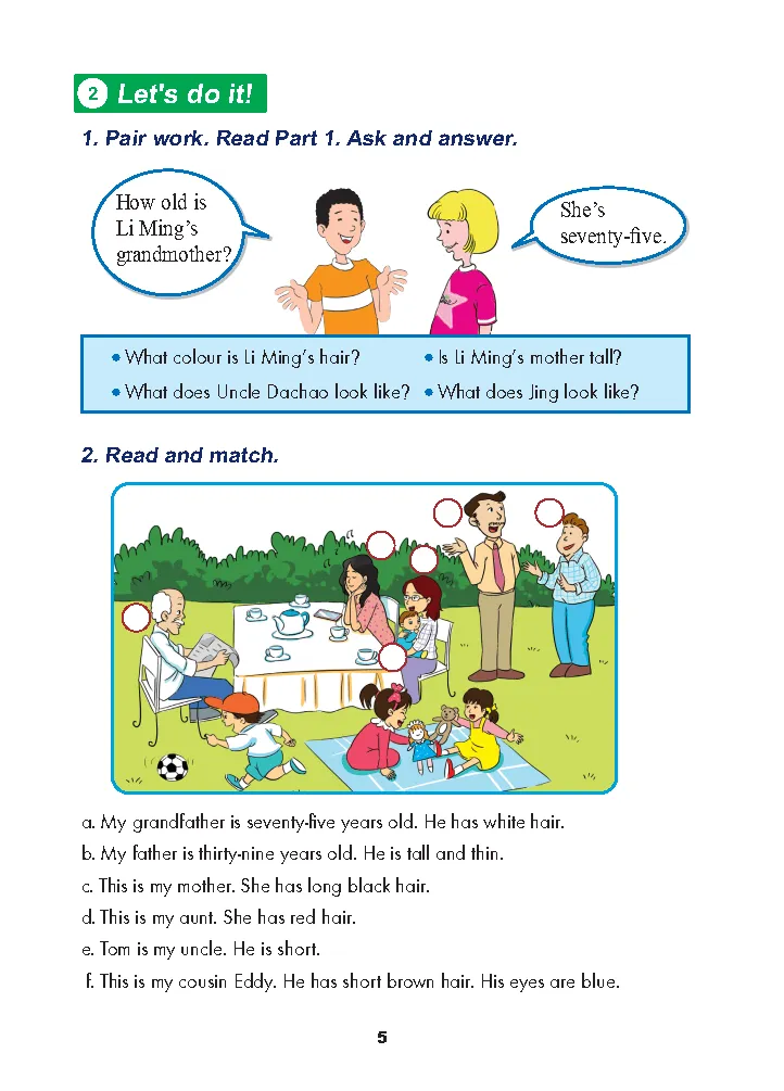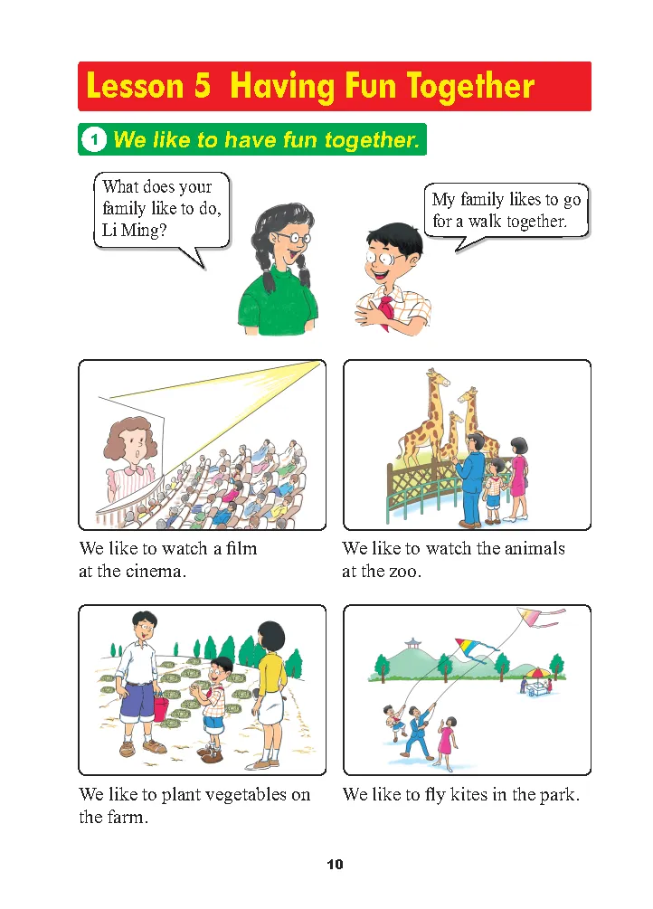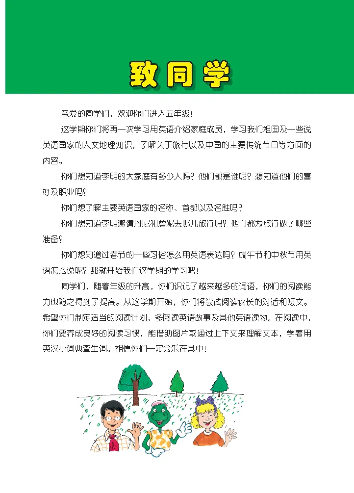 ,然后发送 电子课本 📚2026秋冀教版五年级英语上册第五单元,核心主题是「Having Fun Together(家庭欢乐时光)」,隶属于Unit1 My Family单元的核心课时板块,紧扣“人与自我”范畴,是五年级上册重点基础单元,贴合中年级学生家庭生活场景,适配课前预习、课后巩固、单元复习,既能帮孩子夯实英语语言基础,又能学会用英语描述家庭成员间的共同活动、表达家庭温情,渗透感恩与陪伴的情感教育,吃透这些知识点,轻松应对课堂提问和单元测试,为后续综合语言运用奠定基础!结合搜索到的教材教案与考点细节,本单元知识点重点攻克四大核心模块,补充易错点提醒,帮孩子避坑:一是核心词汇,按“四会、三会、拓展”分类,重点掌握三大类词汇——家庭活动类(go for a walk散步、watch a film看电影、watch animals看动物、plant vegetables种蔬菜、fly kites放风筝、have fun玩得开心)、家庭成员类(延续前序课时,巩固grandparents祖父母、uncle叔叔、aunt阿姨等词汇)、情感与副词类(happy开心的、together一起、often经常、always总是),拓展family time家庭时光、farm农场、cinema电影院等实用词汇,特别提醒易错点:fly kites的正确拼写(切勿漏写kite后的s);plant vegetables中vegetable为复数形式,泛指多种蔬菜;together为副词,常用在句末,如“We play together.”,避免放在动词前;often、always等频率副词,需放在实义动词前面,搭配场景联想+短句记忆法(结合家庭日常场景记词汇,联动短语记忆,如“go for a walk together 一起散步”),比死记硬背更高效,贴合五年级孩子的记忆特点,同时巩固前序课时的家庭成员词汇,形成知识联动[1][6][7];二是核心句型,全是描述家庭共同活动、询问家庭喜好的实用句式,重点掌握四大场景句型:询问家庭共同喜好(What does your family like to do? 你的家人喜欢一起做什么?)、描述家庭共同活动(My family likes to go for a walk together. 我的家人喜欢一起散步。We like to watch a film at the cinema. 我们喜欢在电影院看电影。)、提出家庭活动建议(Lets plant vegetables on the farm. 我们一起去农场种蔬菜吧。We can fly kites in the park. 我们可以去公园放风筝。)、表达活动感受(We have fun together. 我们在一起玩得很开心。),每个句型都搭配简单易懂的例句,贴合家庭日常互动场景,孩子学完就能用,还能进行情景对话和家庭活动介绍仿写练习,适配单元“综合运用家庭相关知识”的教学目标[1][6][7];三是核心语法,重点巩固动词第三人称单数的综合运用(主语为family、he/she等第三人称单数时,动词变三单,如like→likes),掌握频率副词often、always的正确用法(放在实义动词前面),同时巩固“like to do sth”(喜欢做某事)的固定搭配,学习字母组合的发音规则,助力听力提升,同时提醒核心易错点——family作“家庭整体”讲时,谓语动词用三单形式;描述具体家庭成员(复数)时,动词用原形,避免出现“My family like to go for a walk.”的错误;“like to do sth”中间的to不可省略[7];四是单元备考补充,本单元常考题型为单词翻译、单项选择、句型转换、情景对话和看图写句子,贴心给出答题技巧,如句型转换时,三单句型借助助动词does,频率副词位置不变,短语搭配题牢记固定用法,看图题结合画面场景匹配对应的家庭活动短语,整体难度贴合五年级进阶节奏,兼顾听说读写,帮孩子夯实语言应用能力,同时体会家庭陪伴的温暖。