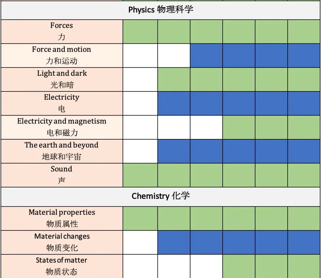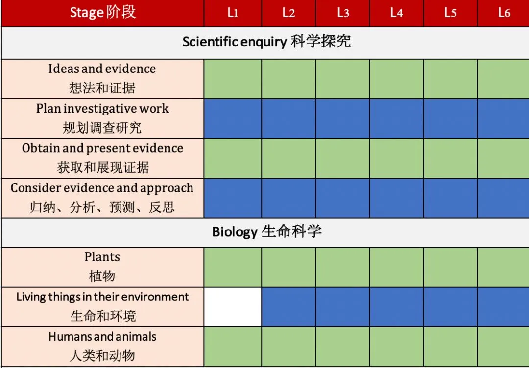 和英美本土科学教育基本一致,《牛津小学科学教材》所体现的国际化科学教育是在四大领域同步进行的:科学方法、生命科学、物理、化学。每个年级的课本里,都同时包括这四方面的内容,分6级(6个阶段)层层递进、螺旋上升 - 4 strands, 6 stages