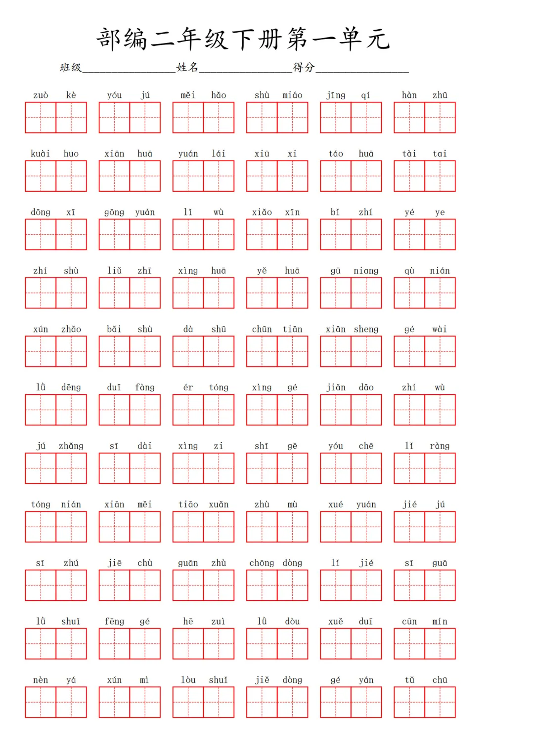 2026年春新版小学二年级语文下册课本同步1-8单元看拼音写词语练习。有助于孩子拼音生字的书写练习,同时还可以预习下册语文知识,做好开学知识的衔接。