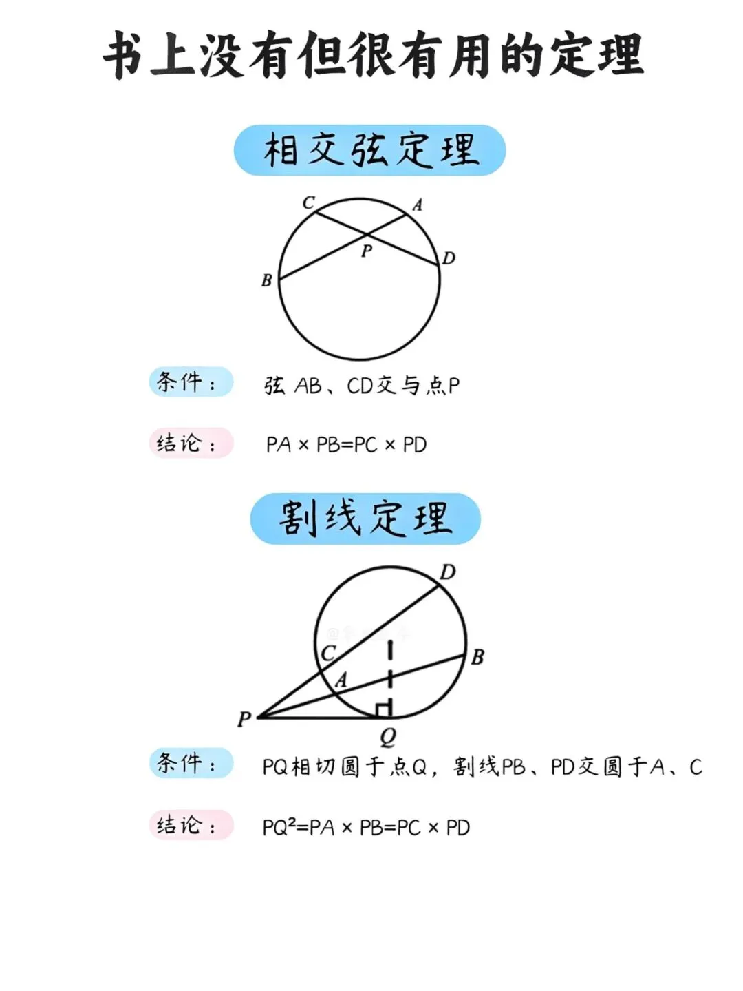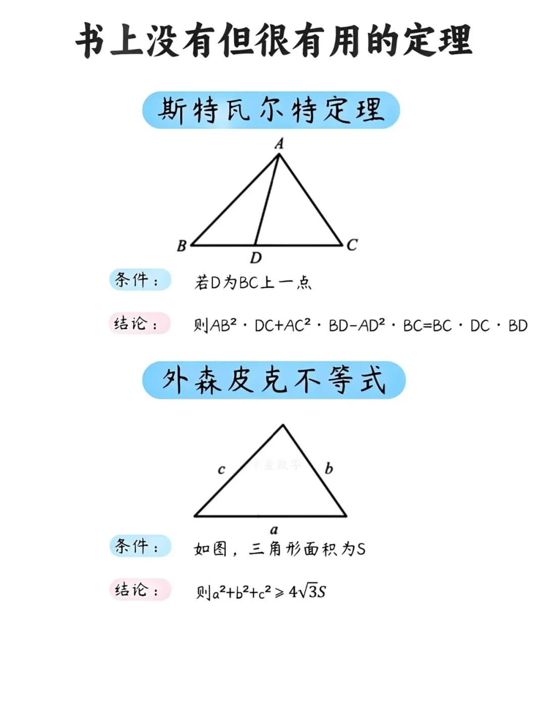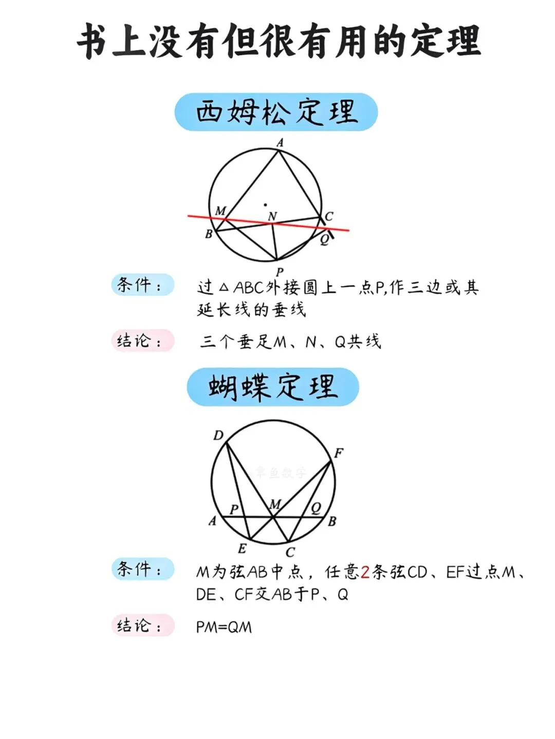 很多同学在解几何题时常常卡壳,明明思路清晰,却苦于计算繁琐。其实,掌握几个课本之外的"隐藏技能",能让你事半功倍。今天就为大家整理了几条超实用的几何定理,建议收藏备用。