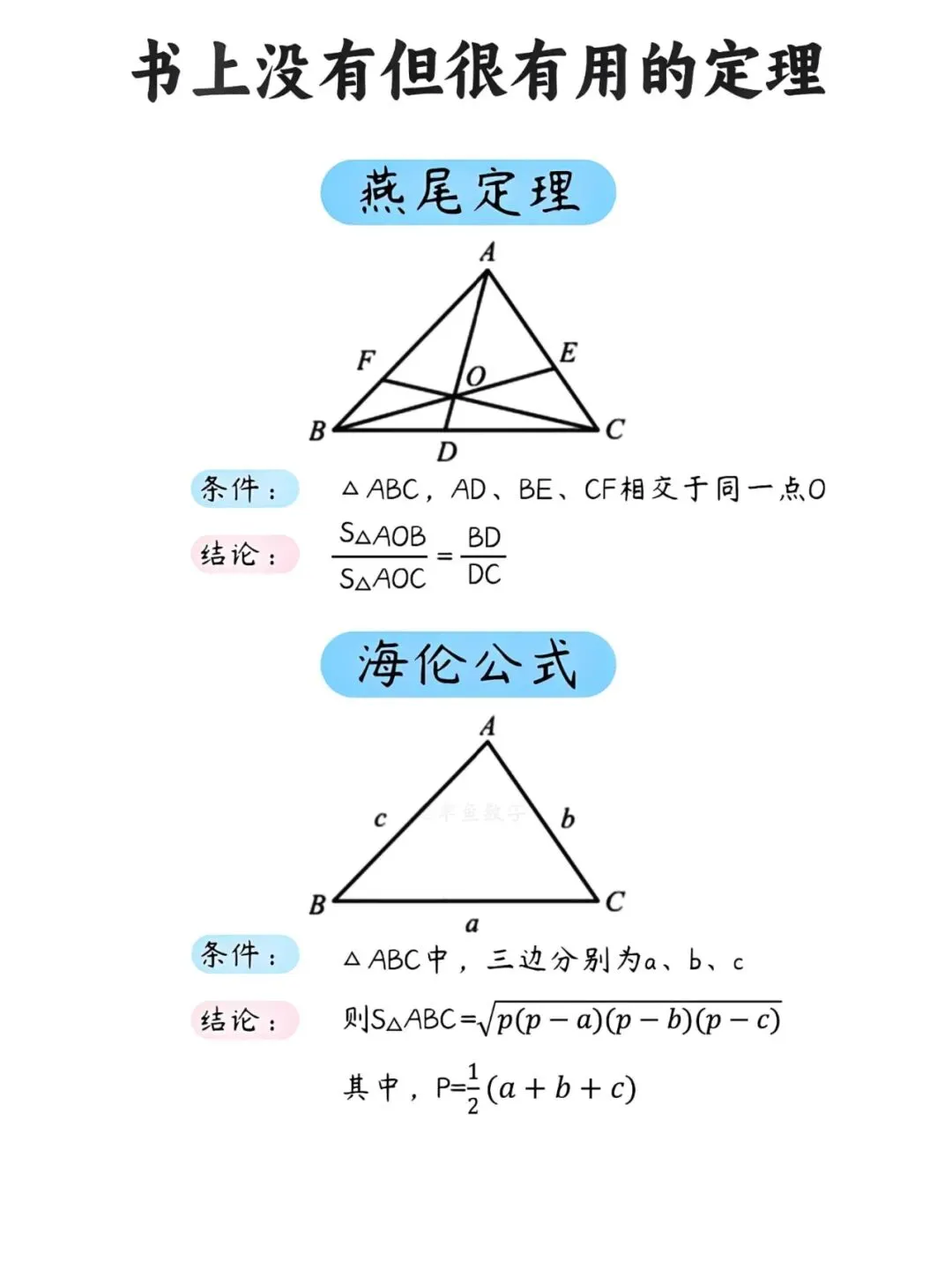 燕尾定理和海伦公式则是面积计算的双保险。前者通过面积比转化线段比,后者让你无需高线就能直接由三边求面积。