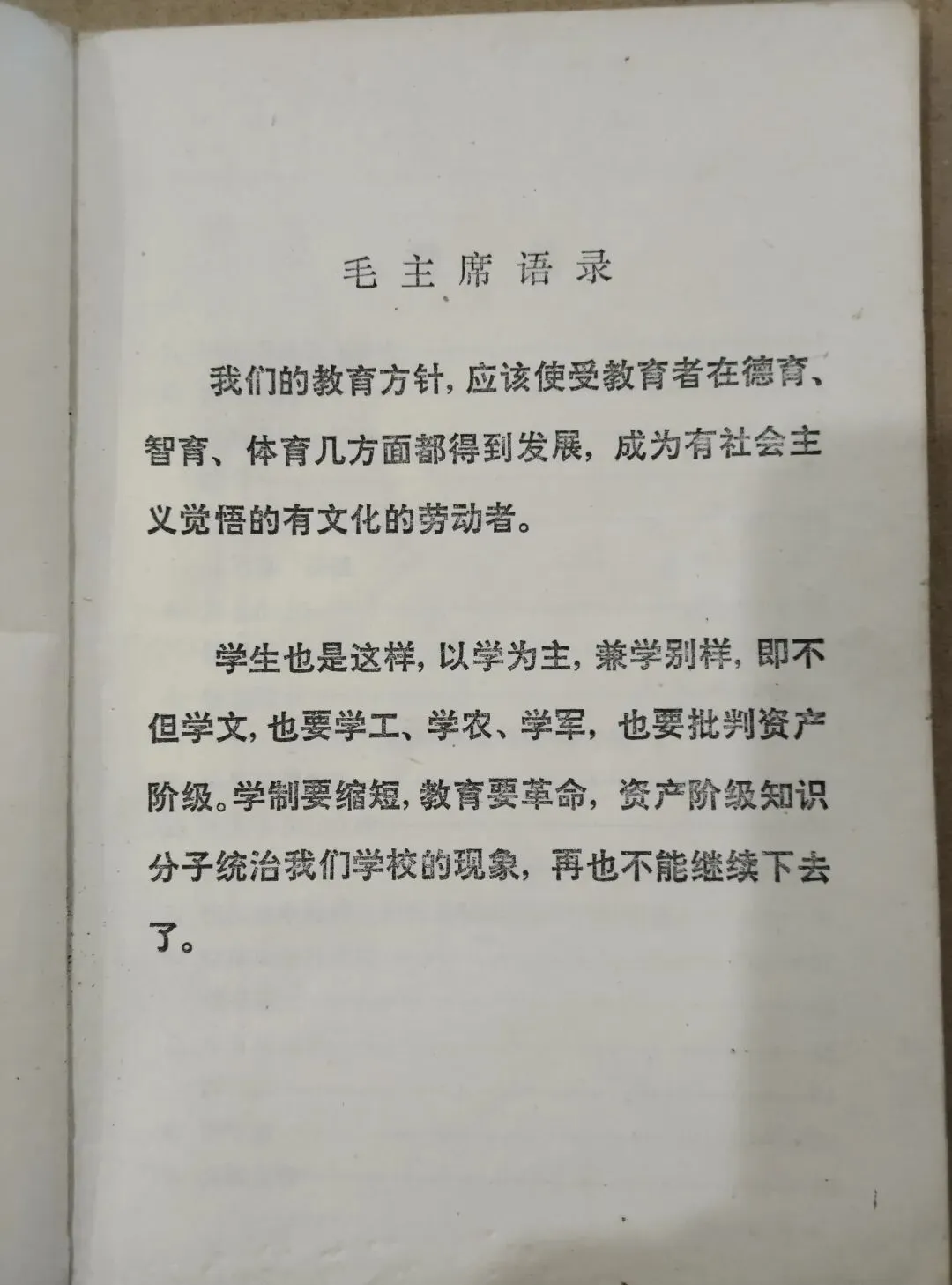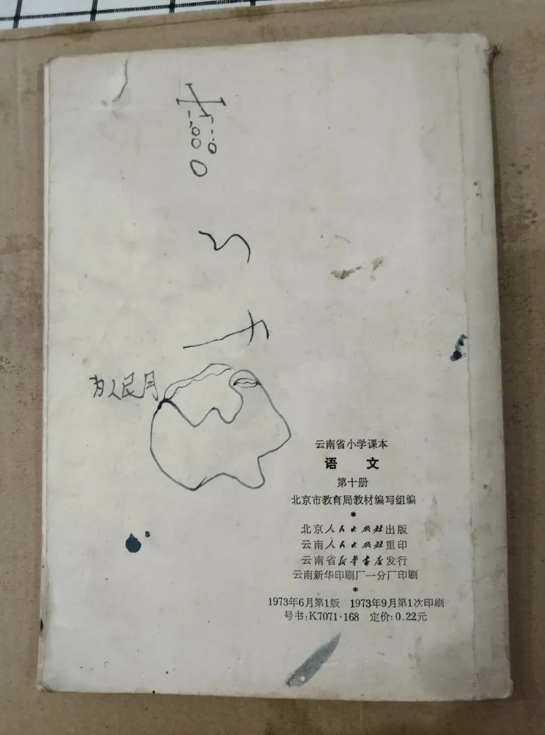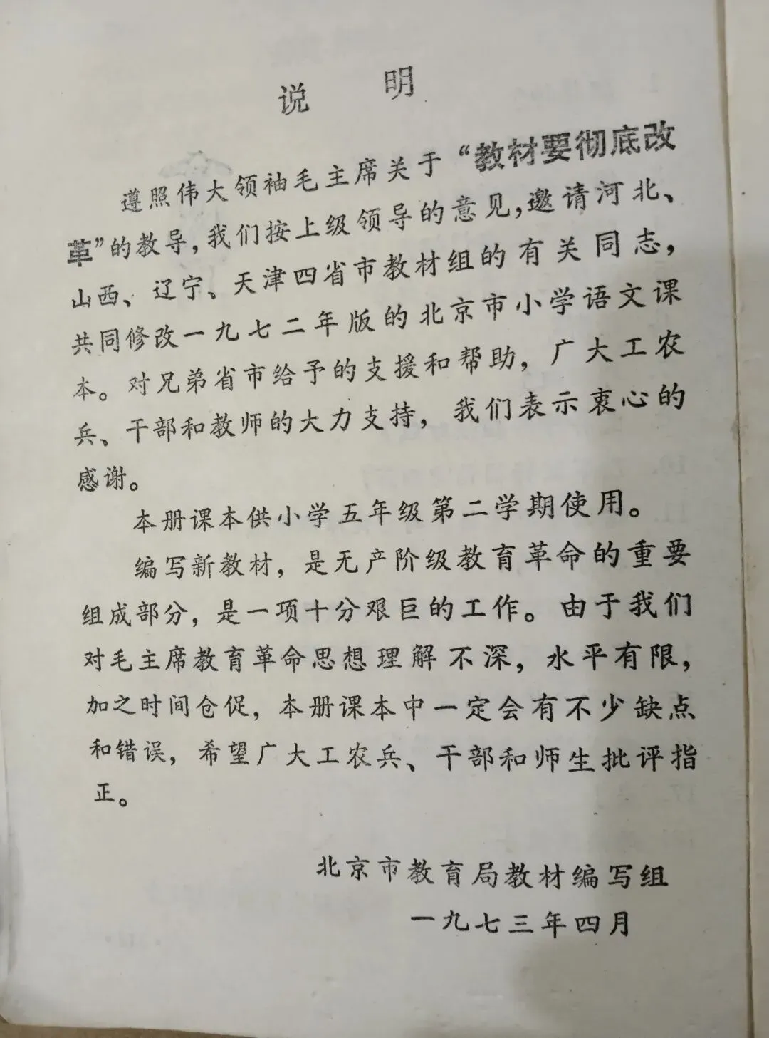 《毛主席语录》选段在课本的扉页,这是当年几乎所有报刊和出版物的统一样式。教材当然要明确教育方针。特别是第二段语录“即不但学文,也要学工,学农,学军,也要批判资产阶级”在当年的学校里是要落实的。我在前面发过的《你知道凤庆一中的分校在哪里吗?》一图文就说到我们高中时到凤庆一中的芒朵分校学农,当时同级的高26班到县农具厂学工,至于批判资产阶级,我在初中的作文里写到过,后面还会分享。第十册教材有18篇课文(包括阅读课文),负担真够轻的,不用减。客观地说,那时学习内容够少的,而且没有课外读物,没有图书阅览室,阅读量太少,获得的外面的信息及学到的知识少。最后是教材编写说明,我们当年的这本教材是北京市教育局教材编写组于1973年4月编写的。从封底知道单价是0.22元一本,当时我们生产队的劳动工日单价大约是每10分工分四角钱左右,一本课本的价格相当于一个劳动力半天的劳动收入(除去应分粮食部分),如果按现在打工每天收入150-200元算,这本课本相当于75——100元,还是有点贵的,所以当时有很多家长不供孩子上学,特别是农村女孩上学的就更少(上高中时,我们班女生只占全班人数的七分之一左右),带来很多文盲,到上世纪九十年代后期,全国教育的一个重点就是扫除青壮年文盲。