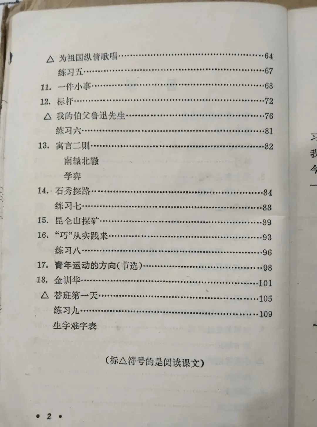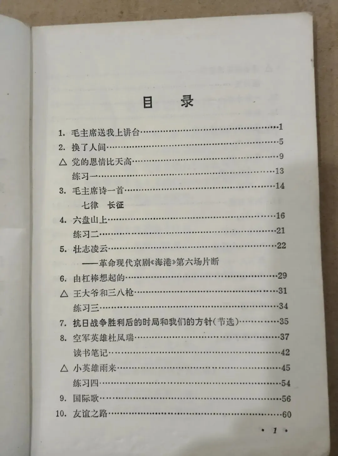 扯远了,上初中和师范时玩赏句子和情节不是52年前,打开的课本里还有哪些课文?教材的编排如何?请看下面的图: