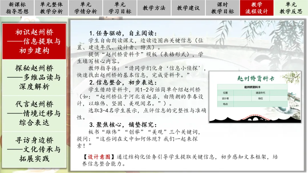 教师指导语:“请同学们化身‘信息小侦探’,快速找出赵州桥的基本信息,完成资料卡。”