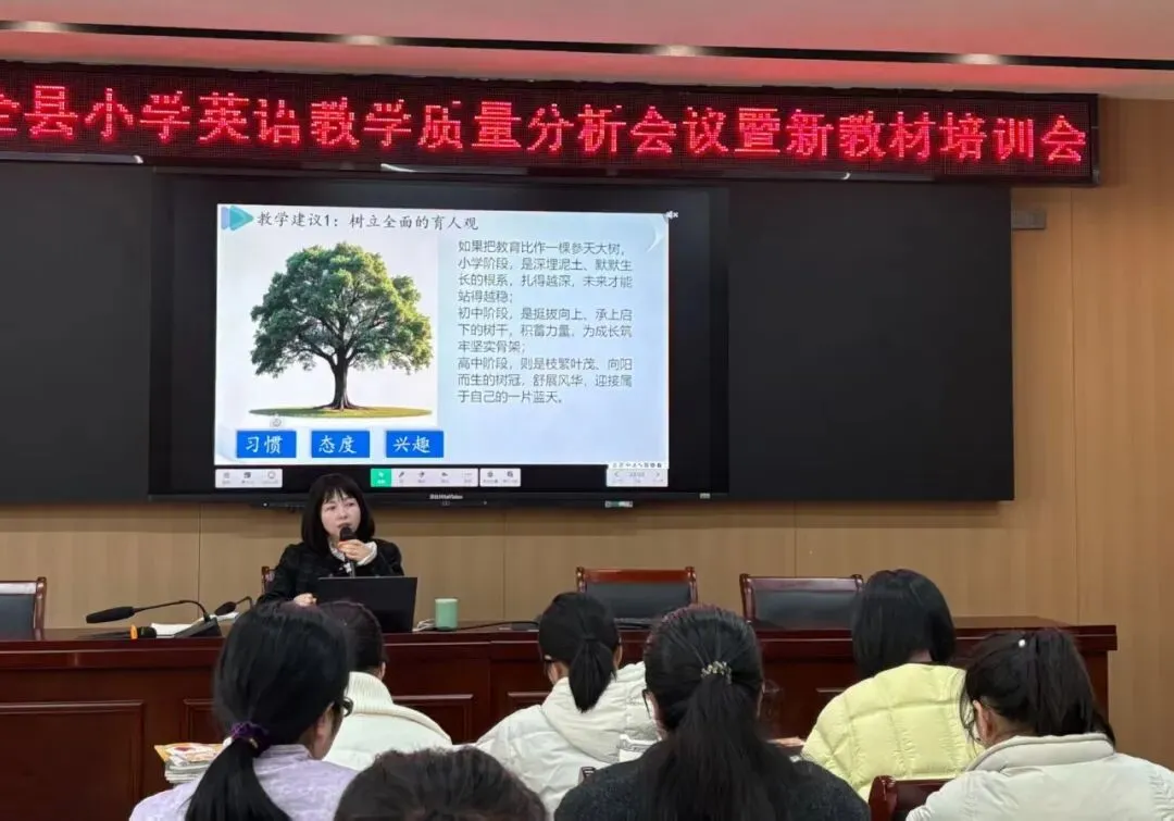 小学英语教研员刘莉莲老师在全县质量分析会上作了题为《数据驱动・精准进阶:从新教材实施到素养落地》的专题讲座。刘老师强调,教学中要树立全面育人观,注重培养学生良好的学习习惯、学习态度与学习兴趣;坚持“健康第一”的理念,塑造学生阳光心态,抓实抓好学生的阅读习惯;同时建议教师积极实践英语学习观下的结构化阅读教学,严格落实课堂教学常规。讲座中,她以详实数据为支撑,对全县各校英语成绩进行横纵向细致对比,精准分析五六年级学情与试卷各小题得分情况,深度梳理典型易错题,并基于数据分析提出针对性教学改进建议。整场分析客观真实、数据充分、细致到位,为全县小学英语下一阶段精准教学、提质增效提供了清晰思路与有力指导。