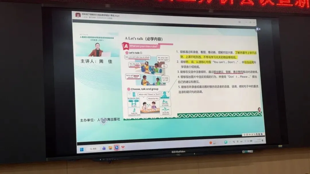 刘老师组织全体教师学习人民教育出版社小学英语室周佳副主任的专题教材培训讲座。周佳副主任结合教学实际提出非常明确的教学指导。她指出教学活动设计需与教学目标精准对齐,紧扣主题意义,突出学习重点;词汇教学板块要显性处理语法现象;Let’s talk板块应立足主题意义开展听说实践,引导学生运用核心功能句进行表达与交流。整场培训内容实用、指导性强,为教师用好新教材,提升课堂实效提供了清晰路径。