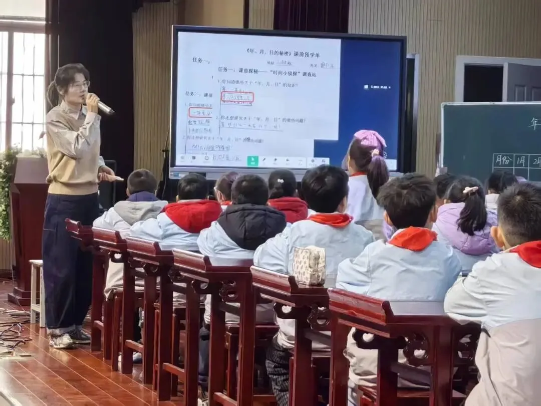随后,戴南小学赵苏雅老师带来《年、月、日的秘密》一课。这节课以“时间小侦探”为主线,精心设计多样化的数学学习活动,将抽象的时间概念与学生的日常生活紧密结合。赵老师巧用动态演示、小组合作探究等教学方法,带领学生层层解锁年、月、日背后的数学知识。整节课以任务驱动教学,环节设计精巧、节奏张弛有度,让学生在趣味探索中掌握知识,同时培养科学的探究精神和合作学习能力。