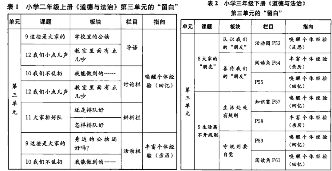 本文所言“留白”指小学《道德与法治》教材中的空白,它覆盖了各个单元、各篇课文、各个栏目。笔者以统编小学《道德与法治》二年级上册、三年级下册教材“我们的公共生活”内容为例对“留白”进行整理。(见表1、表2)
