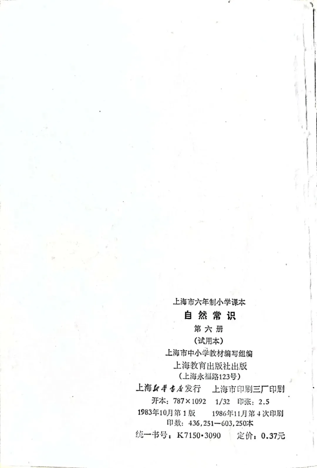 >上海市六年制小学课本(试用本)自然常识·第六册[上海教育出版社·1986年11月一版四印]