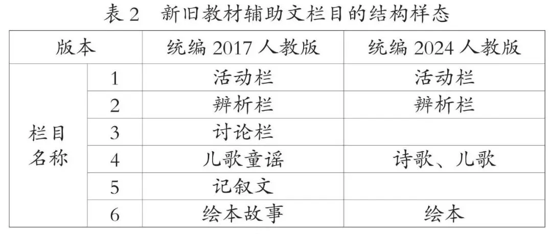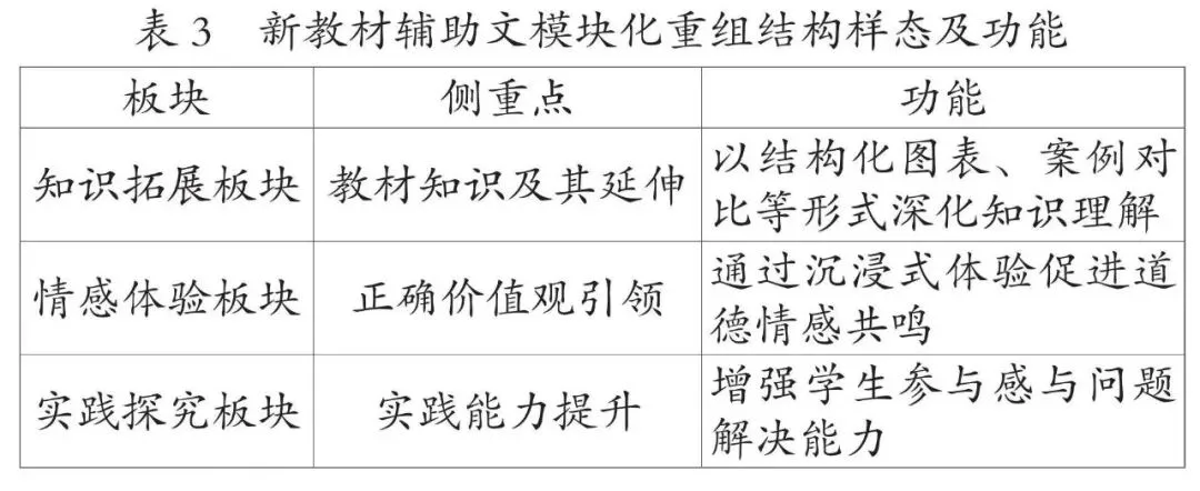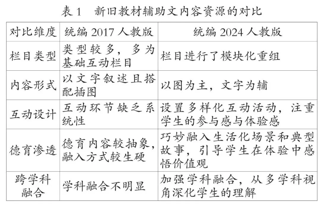 素养导向下,新教材辅助文的实践进阶路径需彰显人文关怀,有温度的辅助文系统建构需秉持以人为本的理念。建构有温度的辅助文系统,需在各小栏目中增强对学生的关照,围绕学生挖掘辅助文系统中蕴含人文关怀的内容,搭建生活化叙事体系,依托文化符号唤醒学生的情感共鸣,并构建“家校社”协同育人共同体,让辅助文系统更具温度,实现新教材辅助文的高质量发展,进一步推动核心素养的落地。(1)生活化叙事系统的重构。新教材辅助文聚焦从知识载体到育人载体的转型,立足儿童主体体验,通过讲述生活化的鲜活故事,实现对儿童经验的创造性转化。辅助文以小栏目的叙事为载体,以儿童熟悉的生活场景、成长问题为蓝本,将抽象的道德与法治知识编码为具体生动的故事文本,通过情节冲突、角色带入设计与认知线索叙述,实现对儿童既有认知和经验的重构。例如,新教材小栏目辅助正文叙述“多彩民族,同样文明”课题时,呈现生活化的民族风俗习惯(如各民族间见面礼的差异),引导学生了解各民族的生活习俗。各小栏目以这种叙事方式拉近教材与儿童生活的距离,使学生在小栏目搭建的情境载体中实现核心素养的自然生长。小栏目亦成为教材知识与儿童成长的桥梁,让道德与法治教材成为有温度的教学载体。(2)情感共鸣机制的创新。教材辅助文构建了“符号解码—情感共鸣—价值内化”的教学体系[4],其中,情感共鸣聚焦学生情感体验的唤醒,以文化符号为载体搭建教材与学生之间的桥梁。辅助文涵盖文字、图像、音频、视频等具有象征意义的文化符号,其编排与选用契合学段学生的认知特点和情感体验,能够最大程度地引发学生的情感认同。在以小栏目为具体呈现形式的文化符号中,各类符号凭借不同特点与功能营造出生动形象的场景,不仅调动了学生的学习兴趣,更提升了课堂参与度。学生在创设的情境氛围中深入感知教材内容,理解符号背后的价值意蕴,并通过多感官参与体验增强情感认同与共鸣,在情感共鸣机制下实现价值观内化。情感共鸣机制在辅助文呈现中还注重时代性与典型性,选取具有代表性的文化符号,使教材内容更贴近学生,通过发挥辅助文浸润心灵的作用,助力学生必备品格、正确价值观和关键能力的内化与提升。(3)协同育人机制的强化。新教材辅助文叙事注重构建家校社协同育人共同体,将辅助文作为连接互动的桥梁,在叙事中巧妙串联三方主体的优势与特点,形成多维度育人合力,助力各主体从传统的“独立场域育人”转向“协同合作育人”,构建辅助文育人的多维立体生态系统。新教材辅助文在三个层面设计探究性实践任务,将课堂延展至学校、家庭与社会,小栏目的任务编排既依托教材内容,又对接家庭与社会生活,使其互为补充,提升辅助文叙事的呈现效果与教材育人效能。例如,辅助文通过绘本栏目设计“我会这样爱家人”亲子互动活动,以绘本提示为基础引导家长与孩子共同参与社会活动,让学生在家庭和社会生活场景中感知家人间的爱,激活家庭和社会教育功能,深化对教材知识的理解与实践。在依托小栏目推进家校社协同育人的实践中,需着重把握栏目设计环节,清晰界定家庭、学校、社会三方的具体任务与权责边界,通过系统化的统筹规划实现三方育人力量的有机整合与高效联动,真正构建起目标一致、分工明确、协同有序的育人共同体。新教材辅助文借助小栏目搭建家校社协同共育平台,形成三位一体的育人共同体,推动教材叙事形成立体架构,助力道德与法治学科核心素养落地。教材辅助文是教材内容补充、学生思维提升与能力建构的载体。“新教材辅助文以生活化知识渗透强化实践性取向。”[5]具身性深度学习系统聚焦学生的身体参与式实践学习,助力学生迈向深度学习与高阶思维。新教材以各小栏目为依托搭建具身性深度学习系统,以真实问题为明线,以数字化赋能为工具,以反思性活动为旨归,由表及里、层层深入地促进思维能力提升,实现从知识到素养生成的深度学习质变与进阶。(1)搭建问题链认知支架。教材以学生学习活动所指向的问题域作为基本结构[6]。新教材辅助文关注问题链的层级设计,该叙事方式以学生的生活经验为出发点,创设生活化情境,并通过分层递进的问题链搭建起从抽象教材内容到具象生活场景的桥梁。分层递进的问题链是从典型事例的冲突中抽象出具有逻辑递进关系的问题序列,引导学生通过任务活动对问题进行思考与解决,逐步完成道德与法治学科教材知识的内化。在辅助文的具体实践中,问题链以“栏目创设情境—问题激活思维—深度探究疑问—教材知识内化”为叙事暗线展开。例如,新教材辅助文在呈现“相亲相爱一家人”时,借助绘本中的问题链展开叙事:先以“家人对我的爱藏在哪里呢?”将讨论引向生活实际,再提出:“你会怎样爱家人?”最后设置开放性问题:“还有哪些爱的表达方式呢?”推动学生将理论认知转化为实践方案。学生在解决问题的过程中实现从抽象教材内容到具象情境问题、再到抽象认知层级的跃迁。通过层阶性问题序列设计,拓展学生的思维和认知,实现从教材内容传递到核心素养提升的跨越,达成新教材辅助文育人效果质的飞跃。(2)构建数字化赋能体系。在教材辅助文的叙事进程中,数字化赋能的栏目呈现离不开人工智能技术的辅助推动。