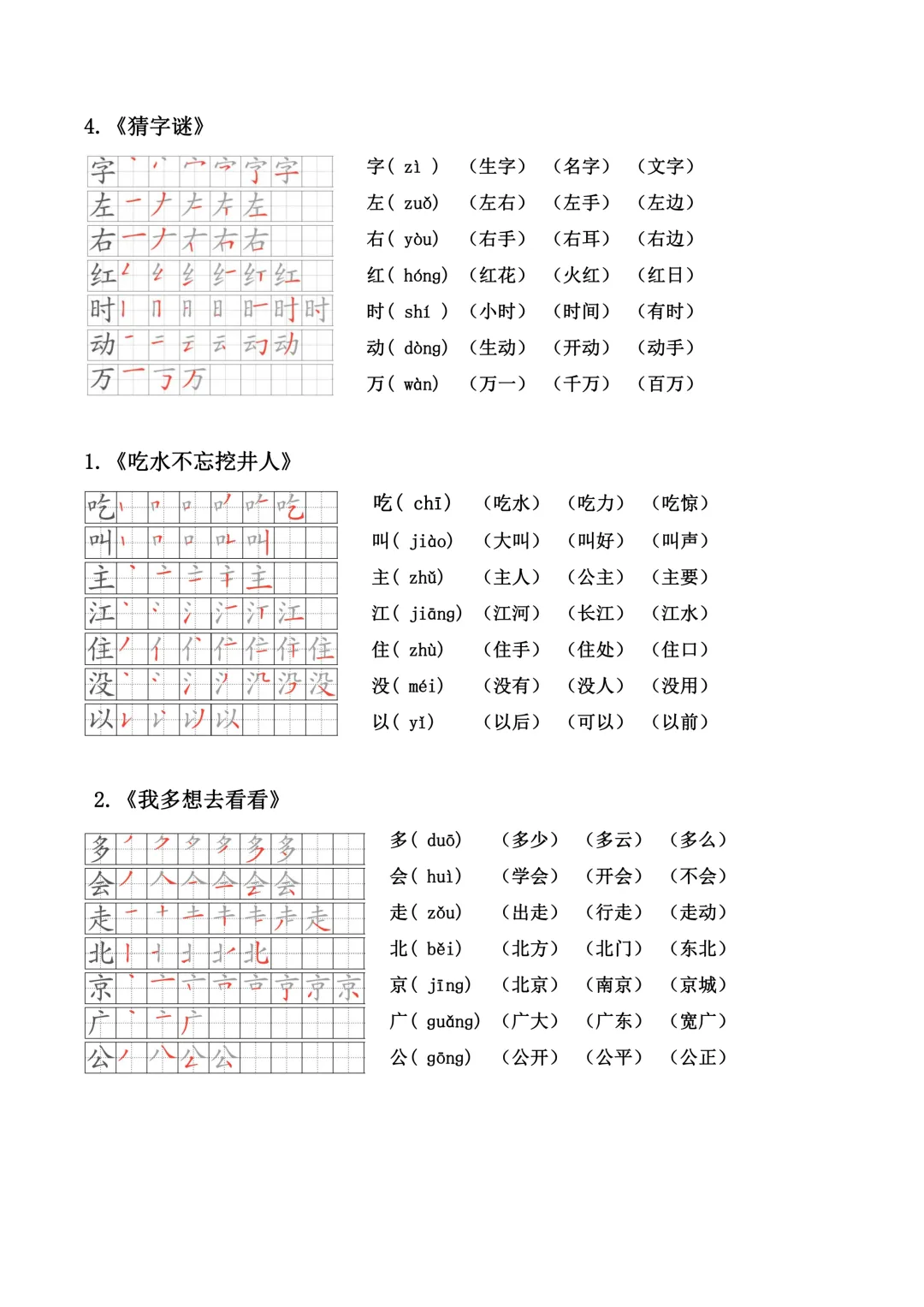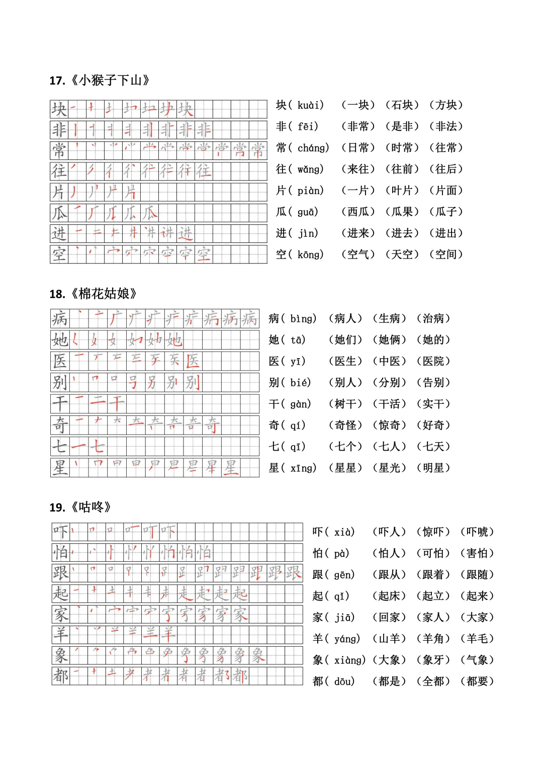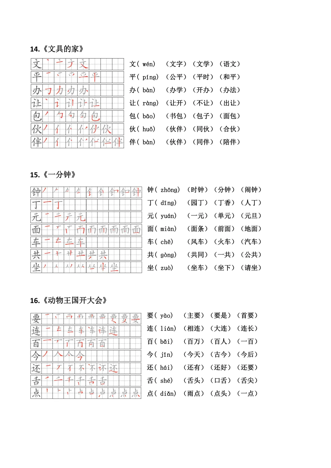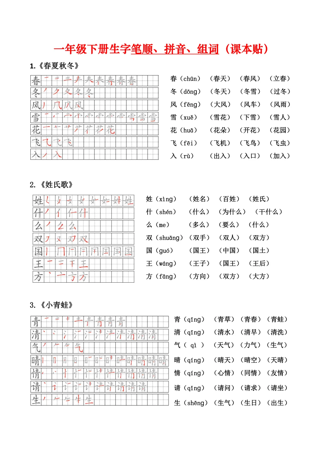 小学语文一年级下册生字笔顺、拼音、组词(课本贴)全册(电子版可打印+免费下载+学习资源)