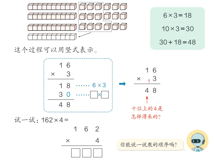 可以提前练习数的组成,强化位值概念,循序渐进,从两位数乘一位数逐步过渡到多位数乘法,练习乘法估值。
