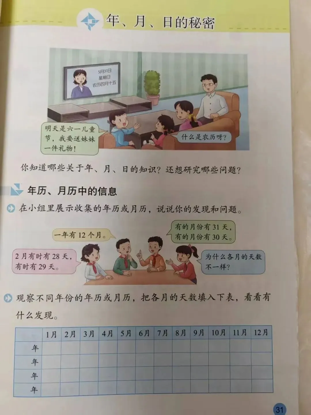 江苏凤凰教育出版社,出版的《三年级下册数学课本》,第31至36页,一个名为“年、月、日的秘密”的综合实践活动单元,从圭表测影到二十四节气,从公历闰年到农历生肖,让孩子们触摸中华先民观测天象、制定历法的智慧。认为:“我国古人确定一年四季和二十四节气的办法真了不起!”