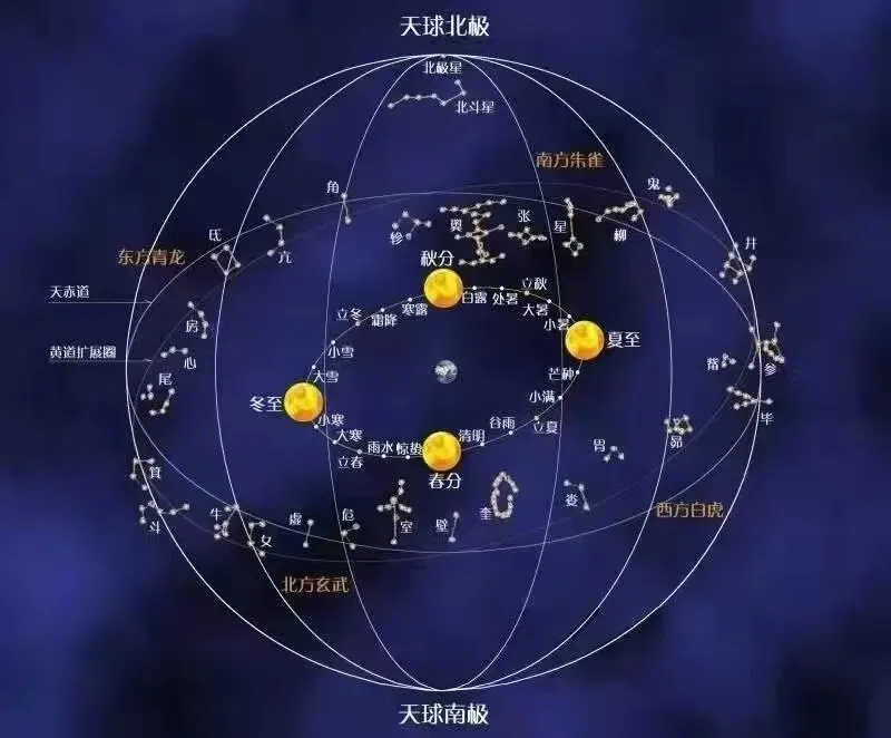 关键在于,中国古代天文学的“天文观测基础”,是观测“天极”、北斗、二十八宿(见《北斗观象系统“天地星空球”》图示),以这些坐标为依据,测定太阳、月亮的运行度数!与“现行公历”的“天文观测基础”,没有半毛钱关系!