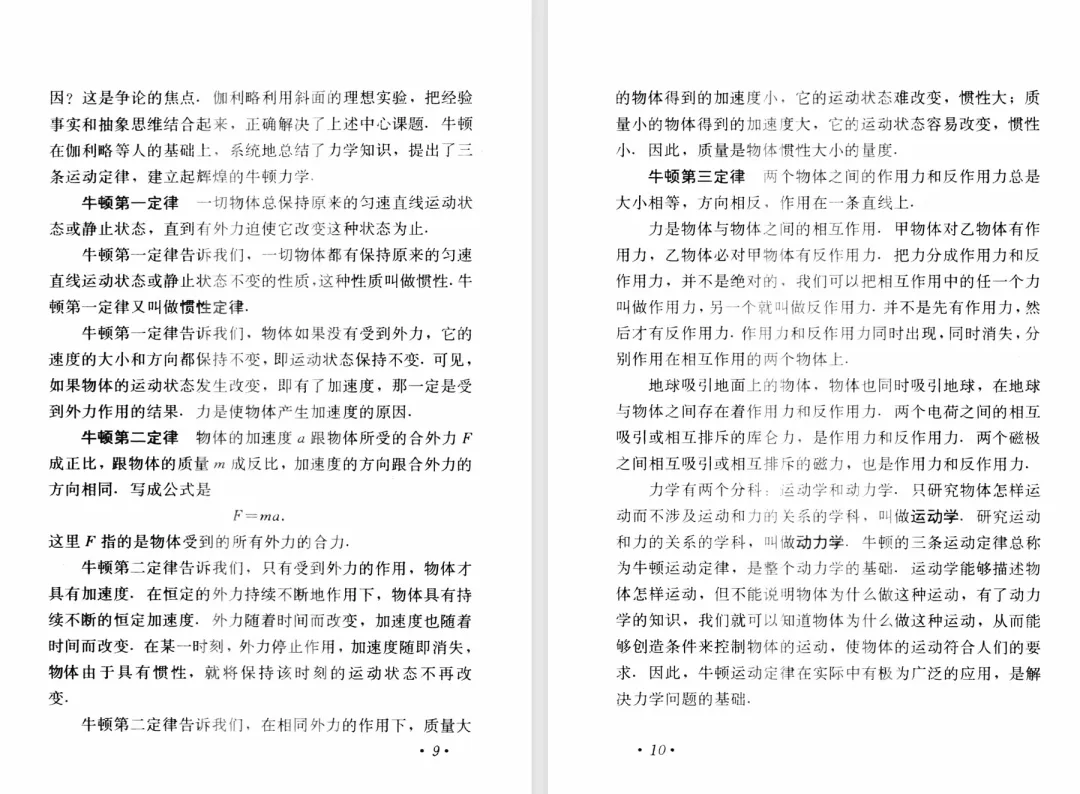 个人感觉这一章的内容编排不好,顺序有些混乱。牛顿运动定律放在力的前面,顺序颠倒。没有力哪来的牛顿运动定律。牛顿运动定律和牛顿运动定律的应用,中间隔了好几个小节,也不合理。应该按这样的顺序编排:力、矢量和矢量运算、受力分析、牛顿运动定律、牛顿运动定律的应用、牛顿运动定律的适用范围。如下表所示,左边是教材的编排,右边是调整后的编排。