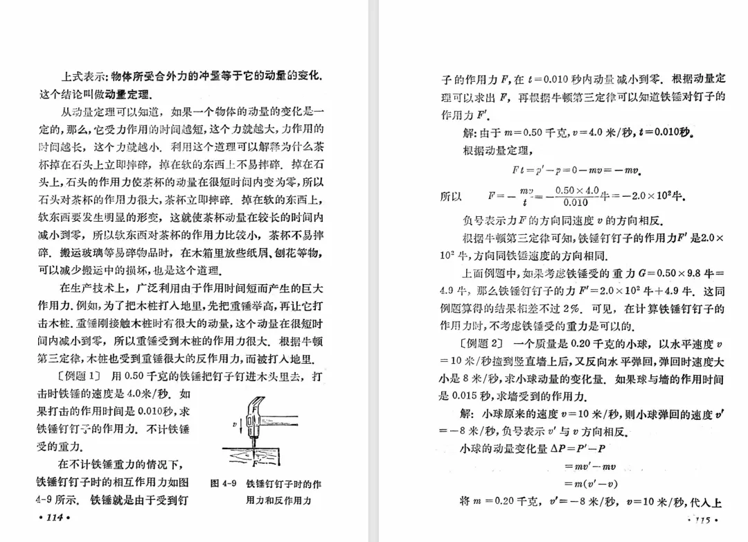 下面是乙种本中介绍完动量定理的内容。下图第114页的举例与本套教材不完全相同,里面的茶杯掉落和搬运易碎物的例子很好,不知道为什么这套教材删除了。当然,这套教材给出的伸手接球的例子也不错。乙种本给出了两个例题。