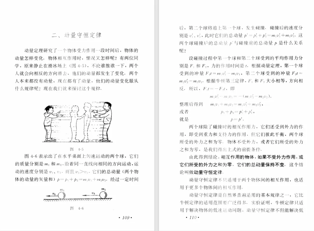 回到这套教材。第二节动量守恒定律的内容在乙种本的基础上做了修改。下图第109页开头滑冰的例子是新增的。