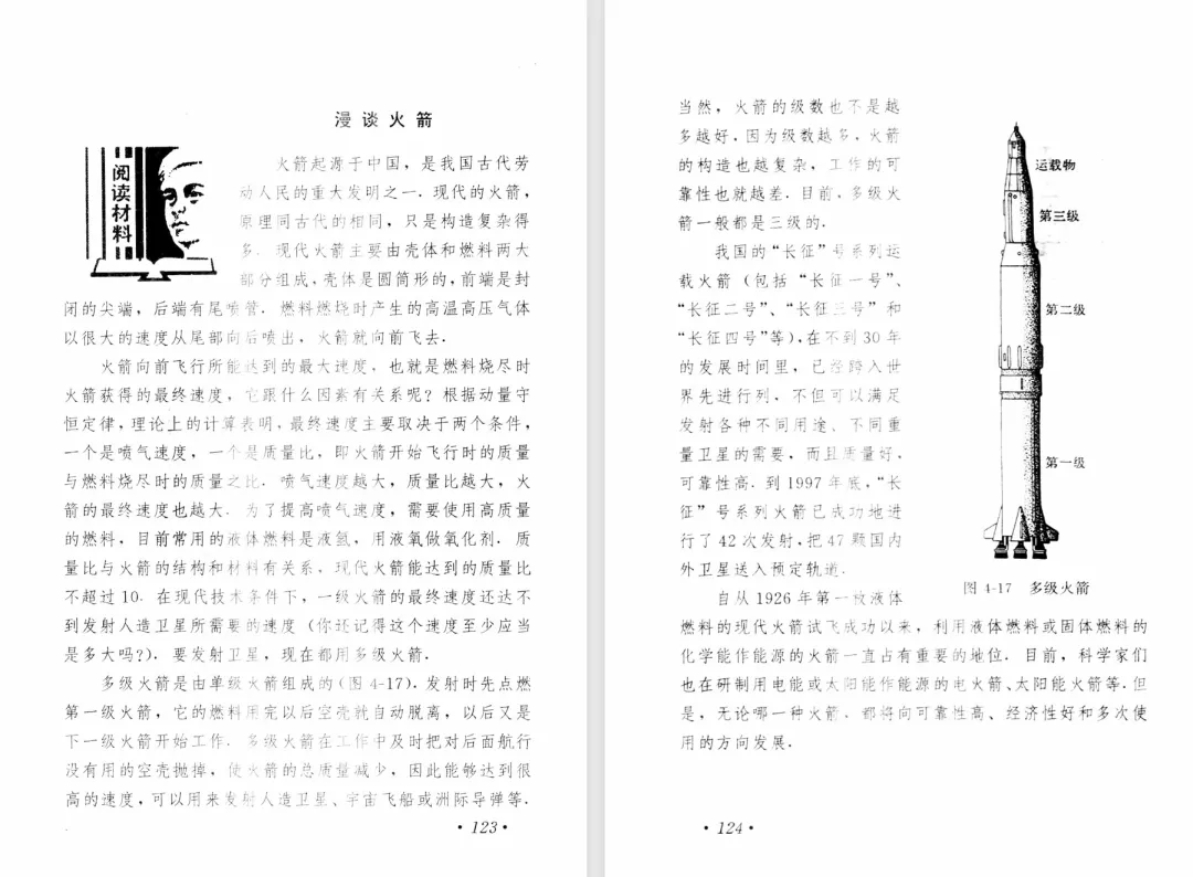 后面还有一个自制小火箭的小实验。这套教材有关火箭的内容包括小节、阅读材料和小实验,内容非常丰富。如果学生按照教学安排,在高三学习本册内容,学到这里,他们会有时间和心情做这个小实验么?
