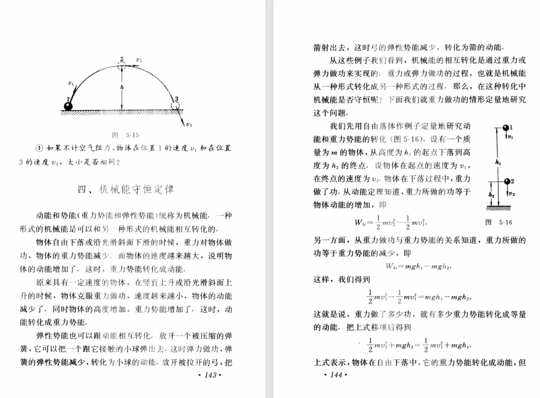 第四节回顾机械能守恒定律。必修里机械能守恒定律只有文字说明,没有文字推导。下面第144页的举例来自甲种本而不是乙种本。