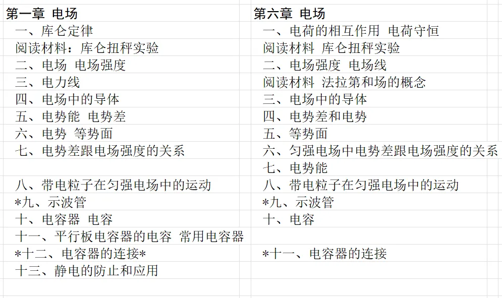 下表中,左边一列是乙种本的目录,右边一列是本册的目录。与电场一章类似,选修中磁场这一章也是重复了很多乙种本的小节,也说明这套教材必修部分没学多少磁场的内容。