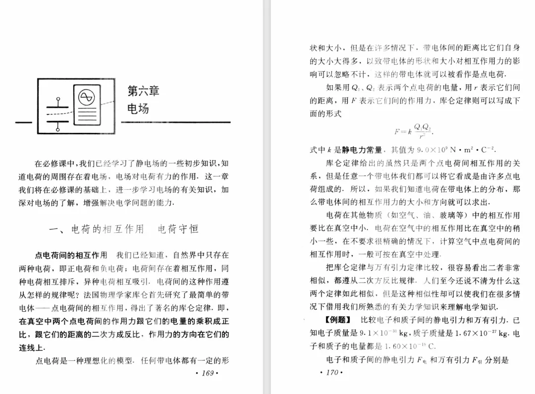 第一节回顾库仑定律。本节的例子在乙种本没有,在甲种本中有,说明了带电微观粒子之间的静电力远远大于万有引力,后者可忽略。