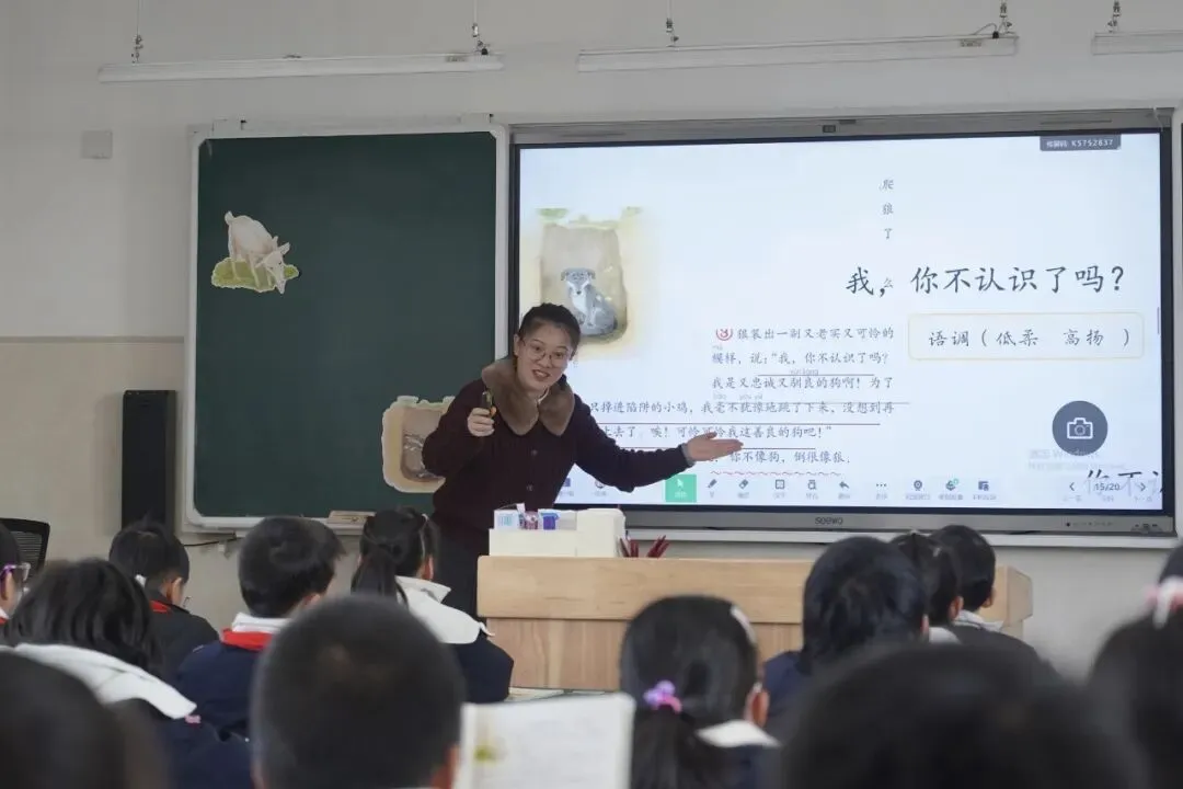 沈佳蓓老师执教三年级下册《会摇尾巴的狼》。她创设“童话故事会”情境,借助《作业本》中的示意图,引导学生补白故事地图。通过品读对话、补充心理,指导学生将对话读得生动有趣。教学由“扶”到“放”,学生思维层层深入。