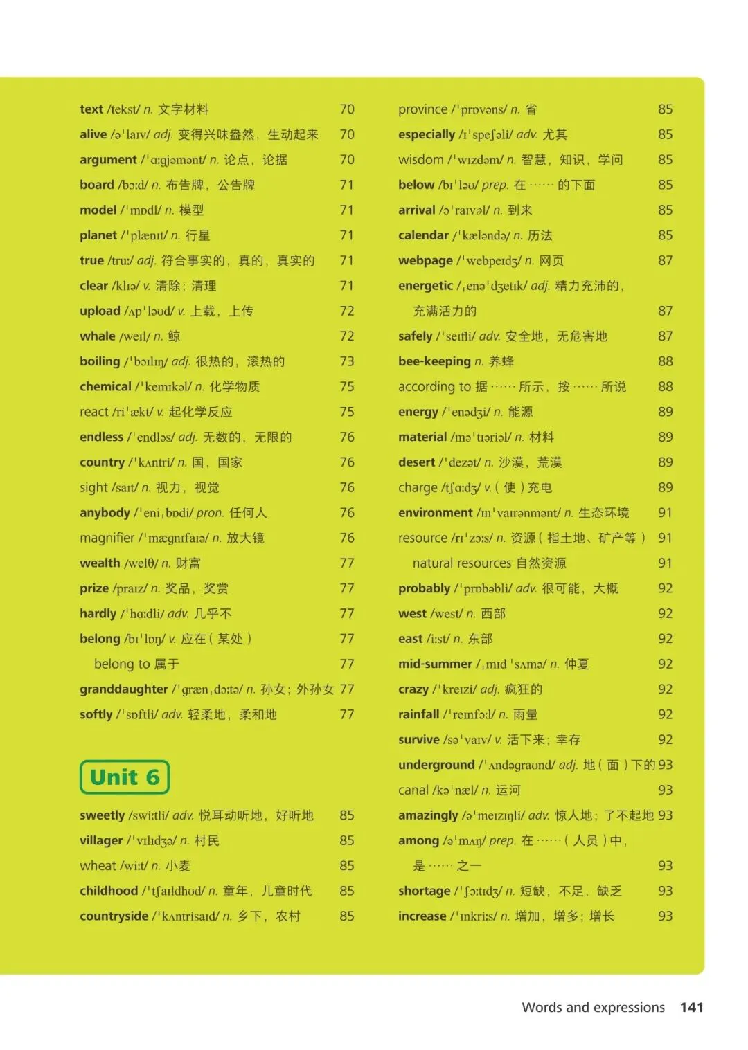 1、communication /kəˌmjuːnɪˈkeɪʃn/ n. 交流2、situation /ˌsɪtʃuˈeɪʃn/ n. 情况3、improve /ɪmˈpruːv/ v. 提高4、develop /dɪˈveləp/ v. 发展5、achievement /əˈtʃiːvmənt/ n. 成就6、experience /ɪkˈspɪəriəns/ n. 经历7、environment /ɪnˈvaɪrənmənt/ n. 环境8、encourage /ɪnˈkʌrɪdʒ/ v. 鼓励9、support /səˈpɔːt/ v./n. 支持10、opinion /əˈpɪnjən/ n. 观点11、discussion /dɪˈskʌʃn/ n. 讨论12、decision /dɪˈsɪʒn/ n. 决定13、relationship /rɪˈleɪʃnʃɪp/ n. 关系14、culture /ˈkʌltʃə/ n. 文化15、traditional /trəˈdɪʃənl/ adj. 传统的16、valuable /ˈvæljuəbl/ adj. 有价值的17、necessary /ˈnesəsəri/ adj. 必要的18、possible /ˈpɒsəbl/ adj. 可能的19、successful /səkˈsesfl/ adj. 成功的20、ancient /ˈeɪnʃənt/ adj. 古代的21、scientist /ˈsaɪəntɪst/ n. 科学家22、experiment /ɪkˈsperɪmənt/ n. 实验23、technology /tekˈnɒlədʒi/ n. 技术24、invention /ɪnˈvenʃn/ n. 发明25、explore /ɪkˈsplɔː/ v. 探索26、journey /ˈdʒɜːni/ n. 旅行27、passenger /ˈpæsɪndʒə/ n. 乘客28、adventure /ədˈventʃə/ n. 冒险29、discover /dɪˈskʌvə/ v. 发现30、challenge /ˈtʃælɪndʒ/ n. 挑战
