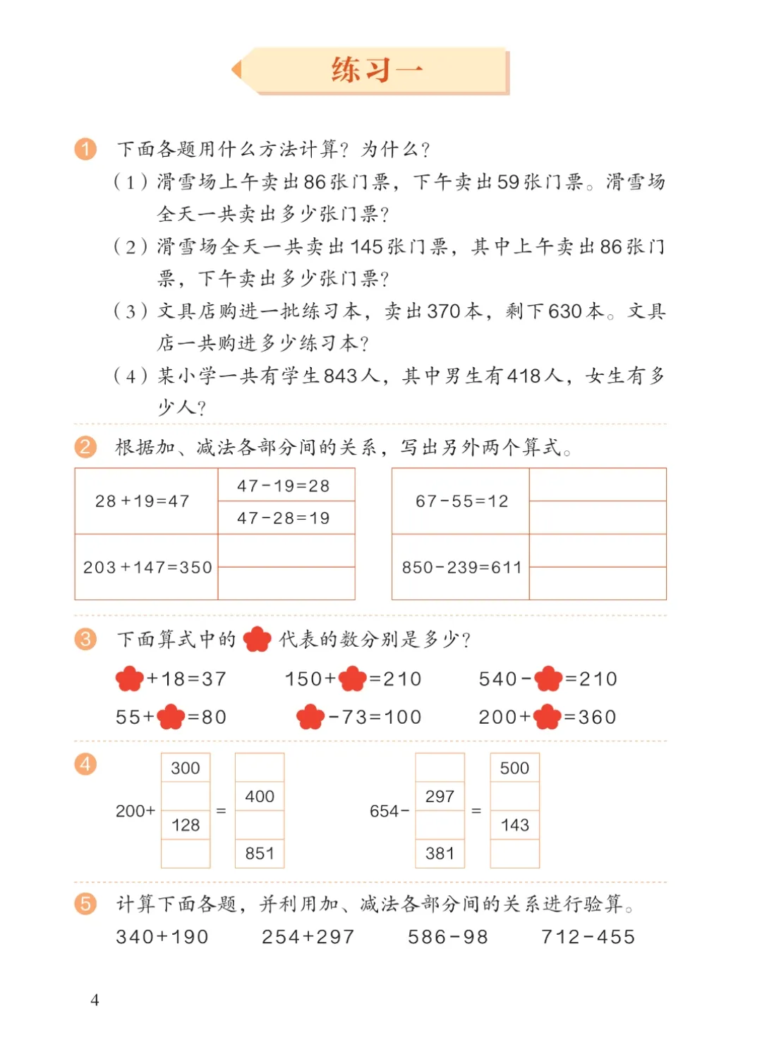 在旧版教材(四年级下册)中,“四则运算各部分关系”是一个独立的单元,更侧重于“数与数”的抽象关系。数学老师说,旧版教材的教学逻辑是:先告诉学生“先乘除后加减”这个规律,然后通过大量的、重复的机械练习来巩固规则。知识是“揉碎了教”的,例题讲一种类型,练习就做这一种类型,就像一个严格的军训教官,强调的是服从和肌肉记忆。