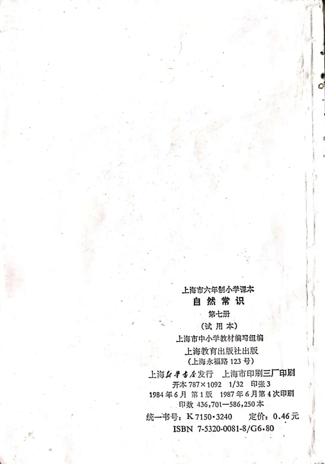 上海市六年制小学课本(试用本)自然常识·第七册[上海教育出版社·1987年6月一版四印]