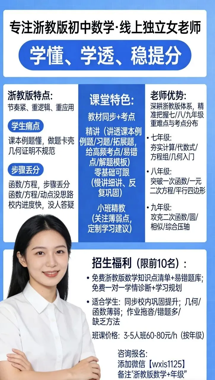 大家好,我是专注浙教版初中数学的线上独立老师。没有花哨包装,只做一件事:紧扣浙教版教材,帮孩子把数学学懂、学透、稳提分。
