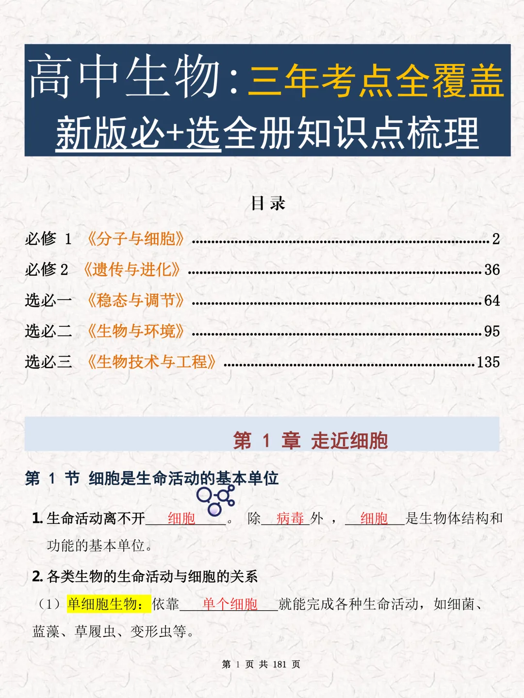 为此今天把已经整理好的【2026新高考】新教材高中生物知识点梳理(背诵收藏版)分享给大家,高中三年有这一份就够了!