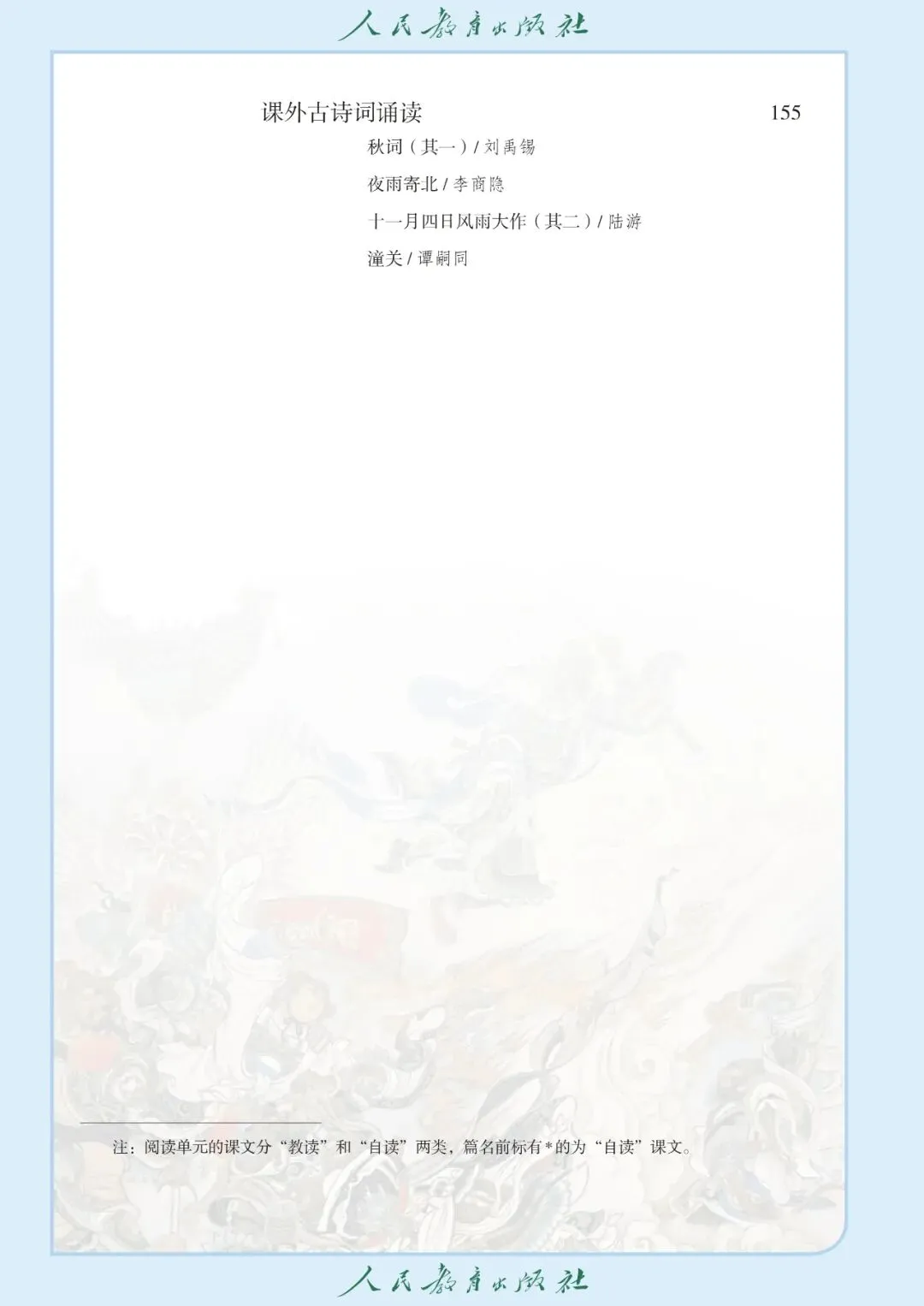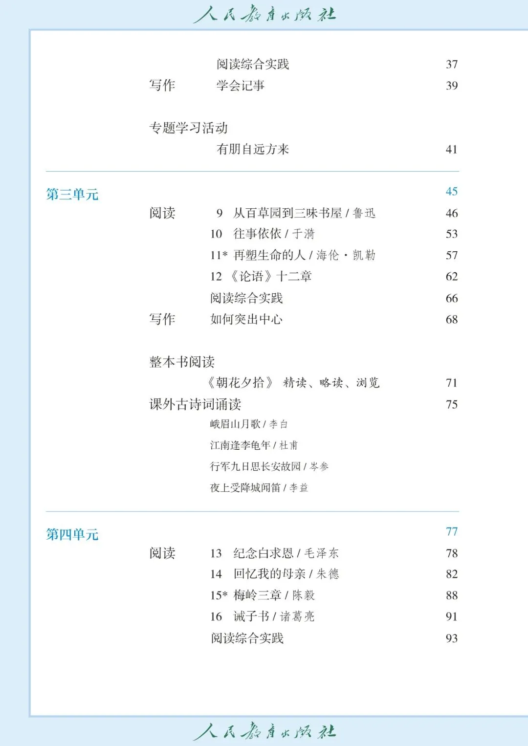 【5】第五单元 古诗文入门:主要内容包含文言实词和常见虚词的理解、重点句子的翻译、古诗词的朗读与背诵、诗歌意象与情感的初步分析、文言文阅读方法