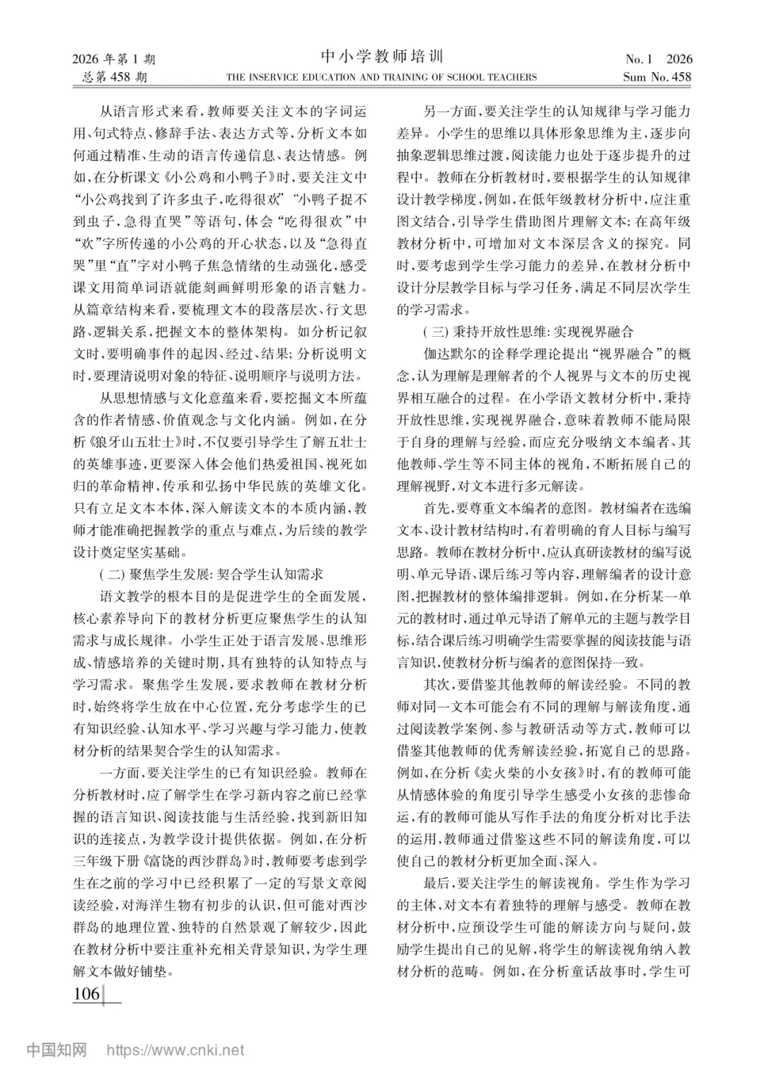 教材作为语文教学活动的重要载体,是教师引导学生开展语言学习、提升语文素养的关键依托。著名教育家叶圣陶指出,教材无非是个例子,凭这个例子要使学生能够举一反三。这深刻凸显了教材在语文教学中的重要地位,也强调了教师深入分析教材的必要性。在核心素养导向的小学语文教学改革背景下,新教材在内容选编、编排体例、育人目标等方面均有创新,更加注重培养学生的文化自信、语言运用、思维能力与审美创造等核心素养。然而,实践中部分小学语文教师在教材分析时存在诸多问题,有的仅关注文本表面的知识点,忽视核 心素养的渗透; 有的缺乏学生视角,未能结合学生认知特点设计教学; 还有的受固有经验束缚,难以把握新教材的编写意图。因此,构建科学、系统的教材分析理念、框架与策略,对小学语文教师落实新课标要求、提升教学质量、培育学生核心素养具有重要意义。
